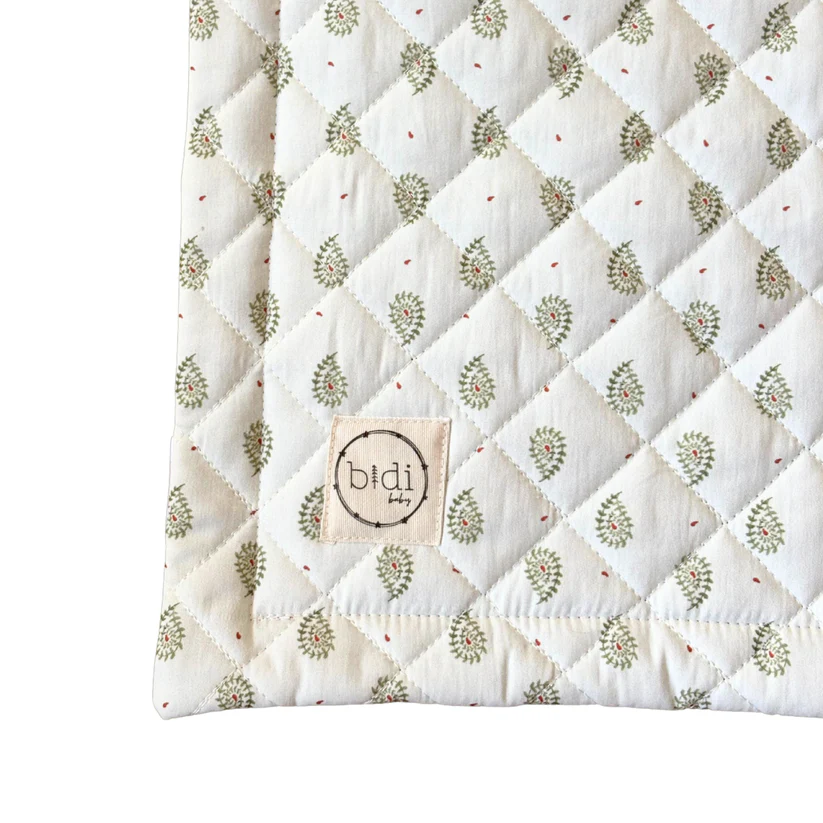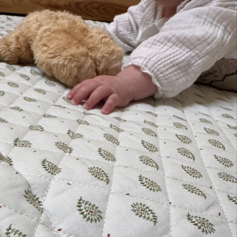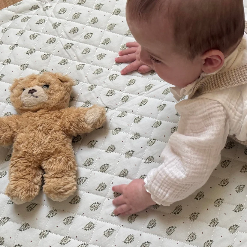 Manta de juegos con estampado silvestre en tonos verdes con un toque mandarina y con fondo color avellana en su parte inferior.