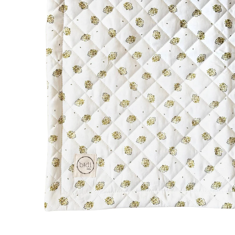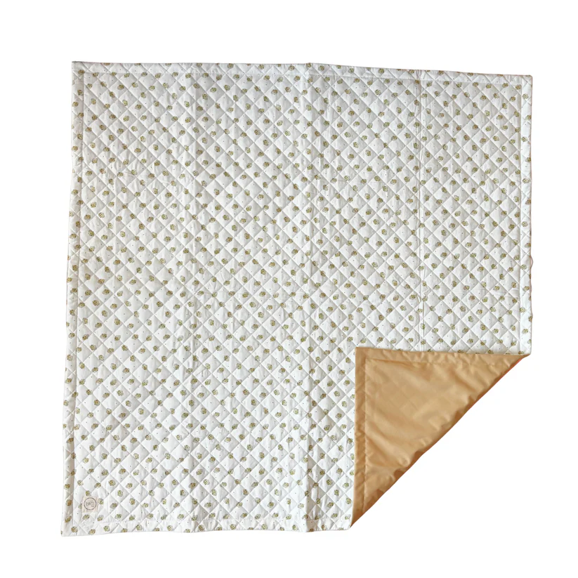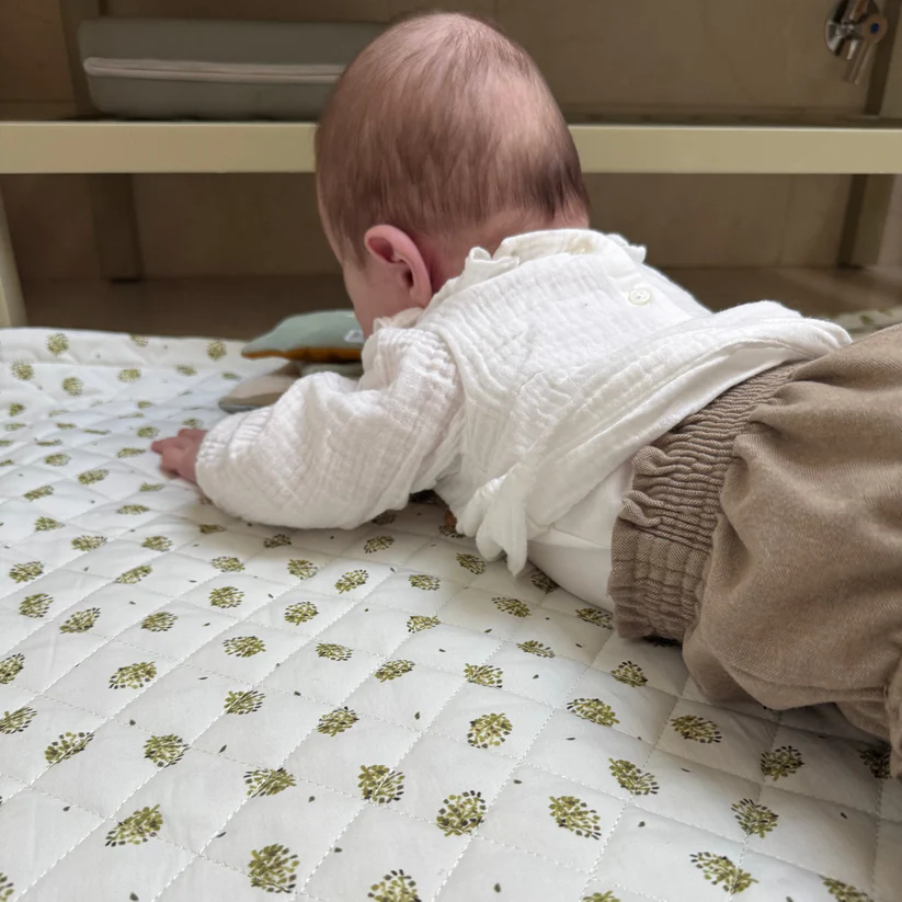 Manta de juegos con estampado de ramitas en tonos mostaza, verdes y marrones con fondo color beige en su parte inferior.