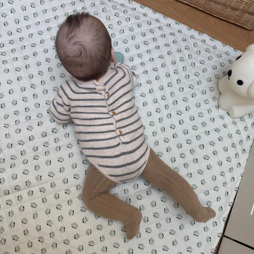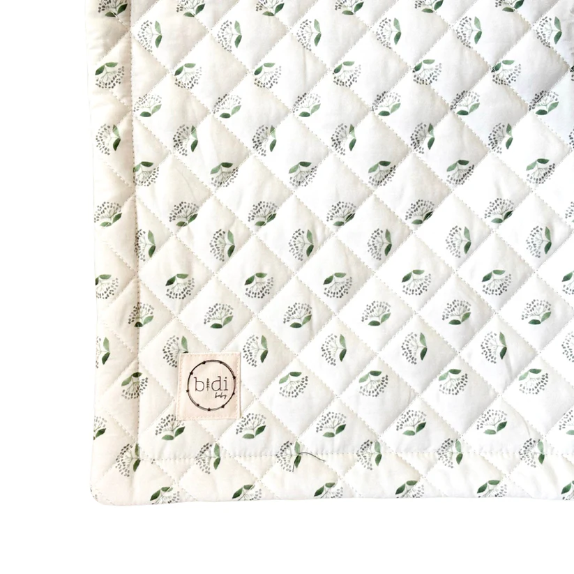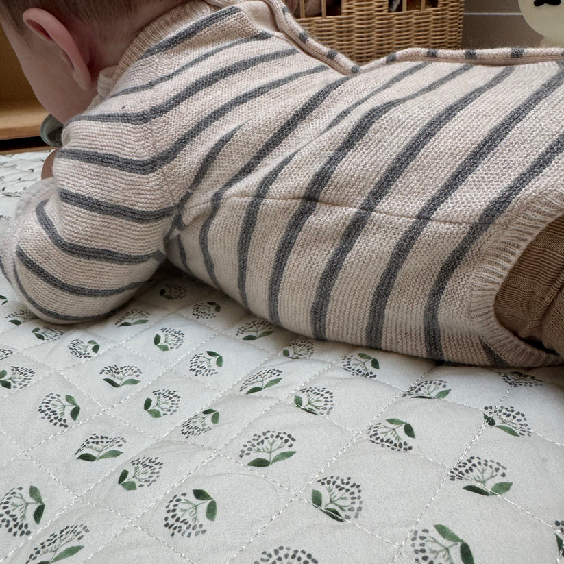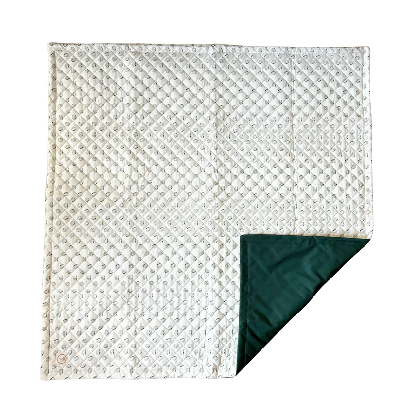 Manta de juegos con estampado silvestre con flor gris y tallo verde y con fondo color verde oliva.
