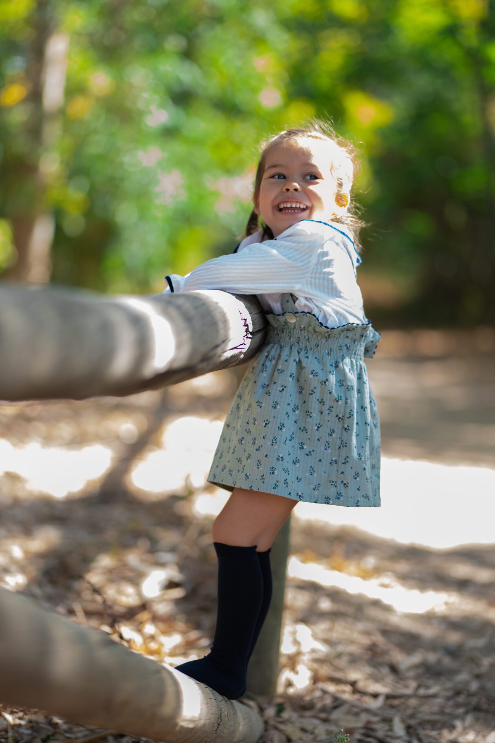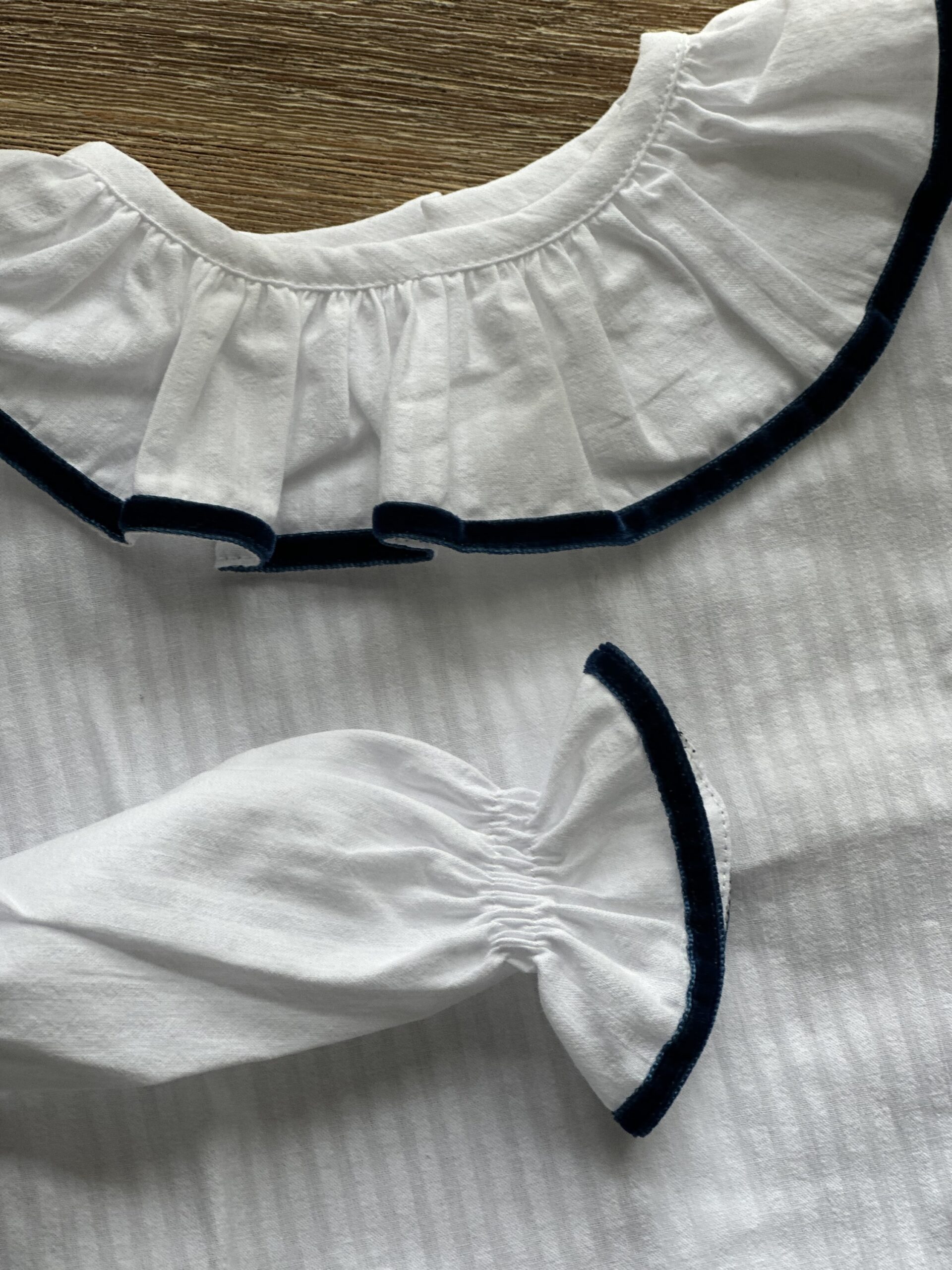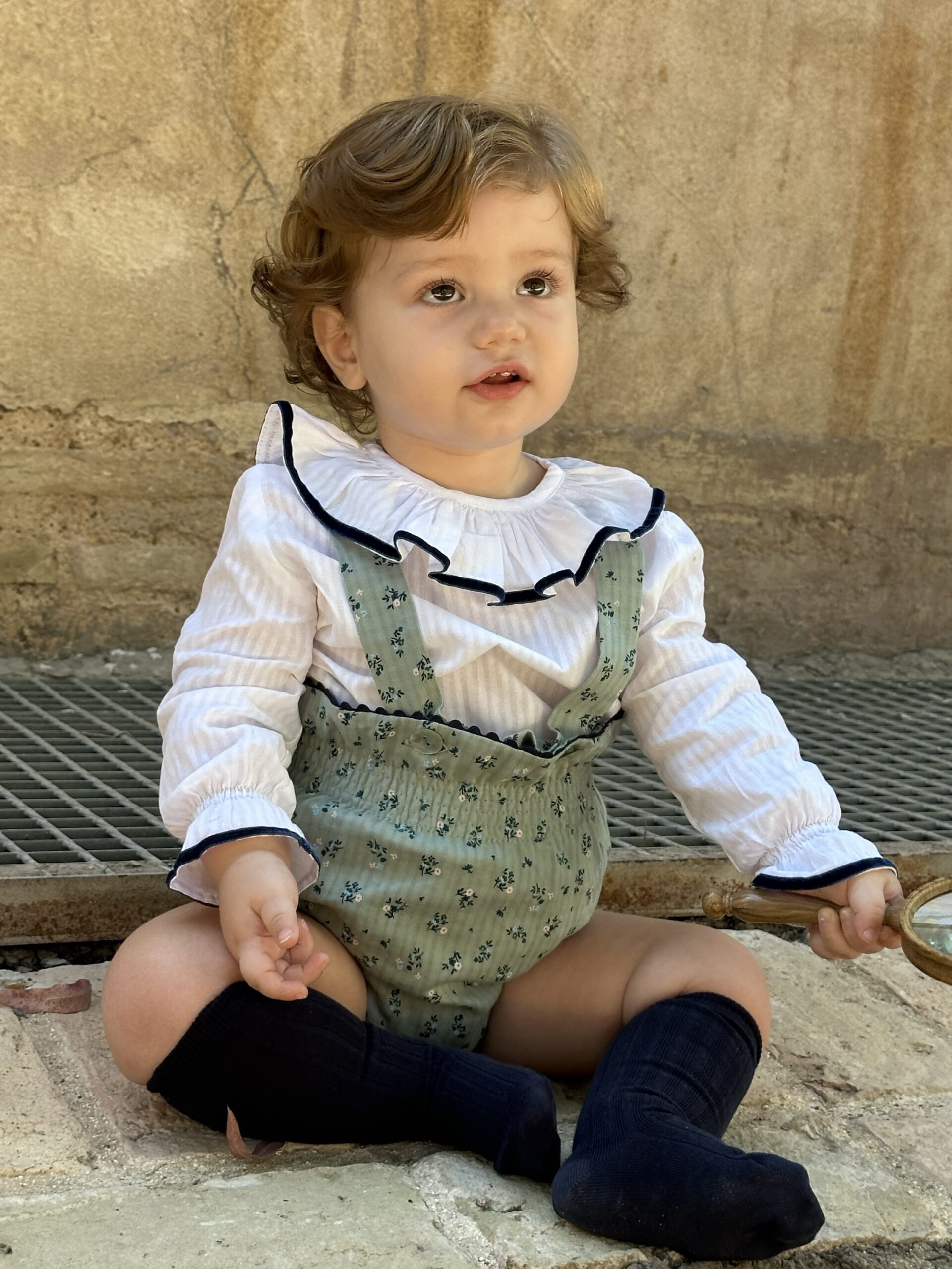 Blusa infantil de estilo clásico con estampado floral, cuello con volantes y tela suave al tacto. Ideal para combinar con la Falda Menta o crear un total look con la Falda Petra.