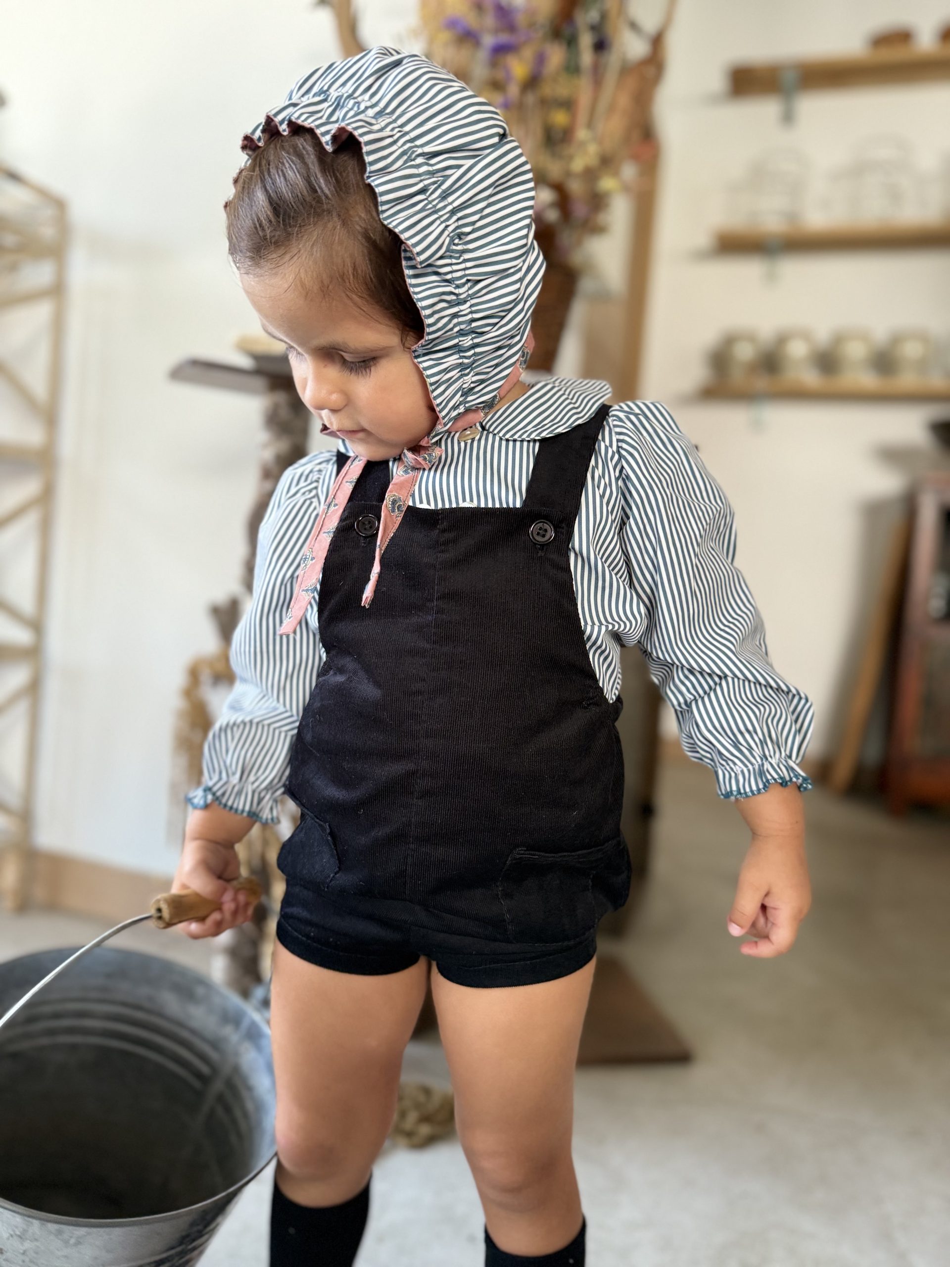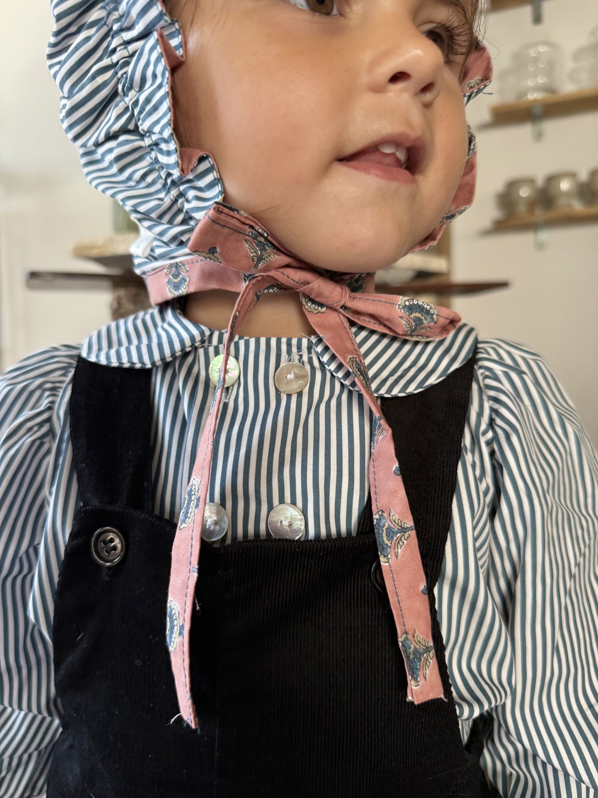 Capota con engomado en la parte delantera y lazada en mismo tejido, el engomado delantero permite adaptarse perfectamente al crecimiento.