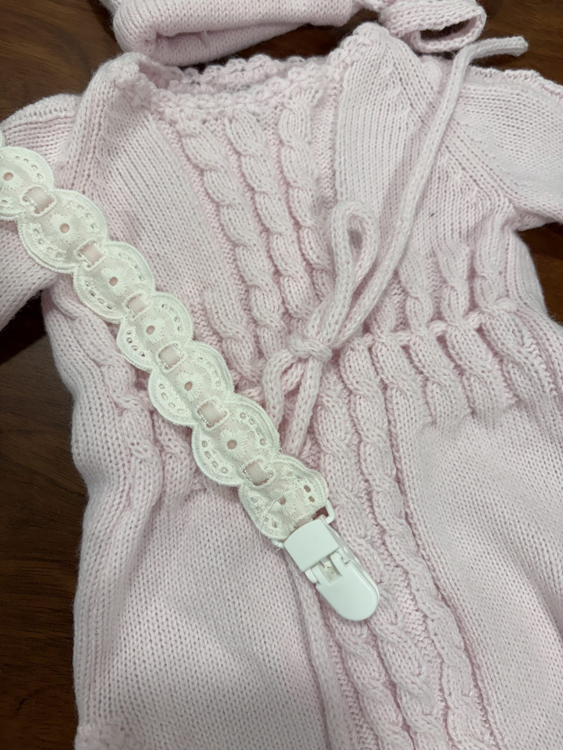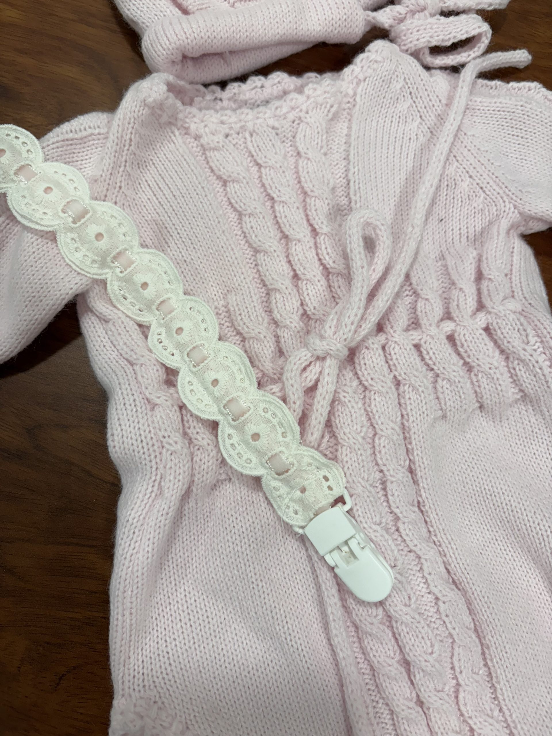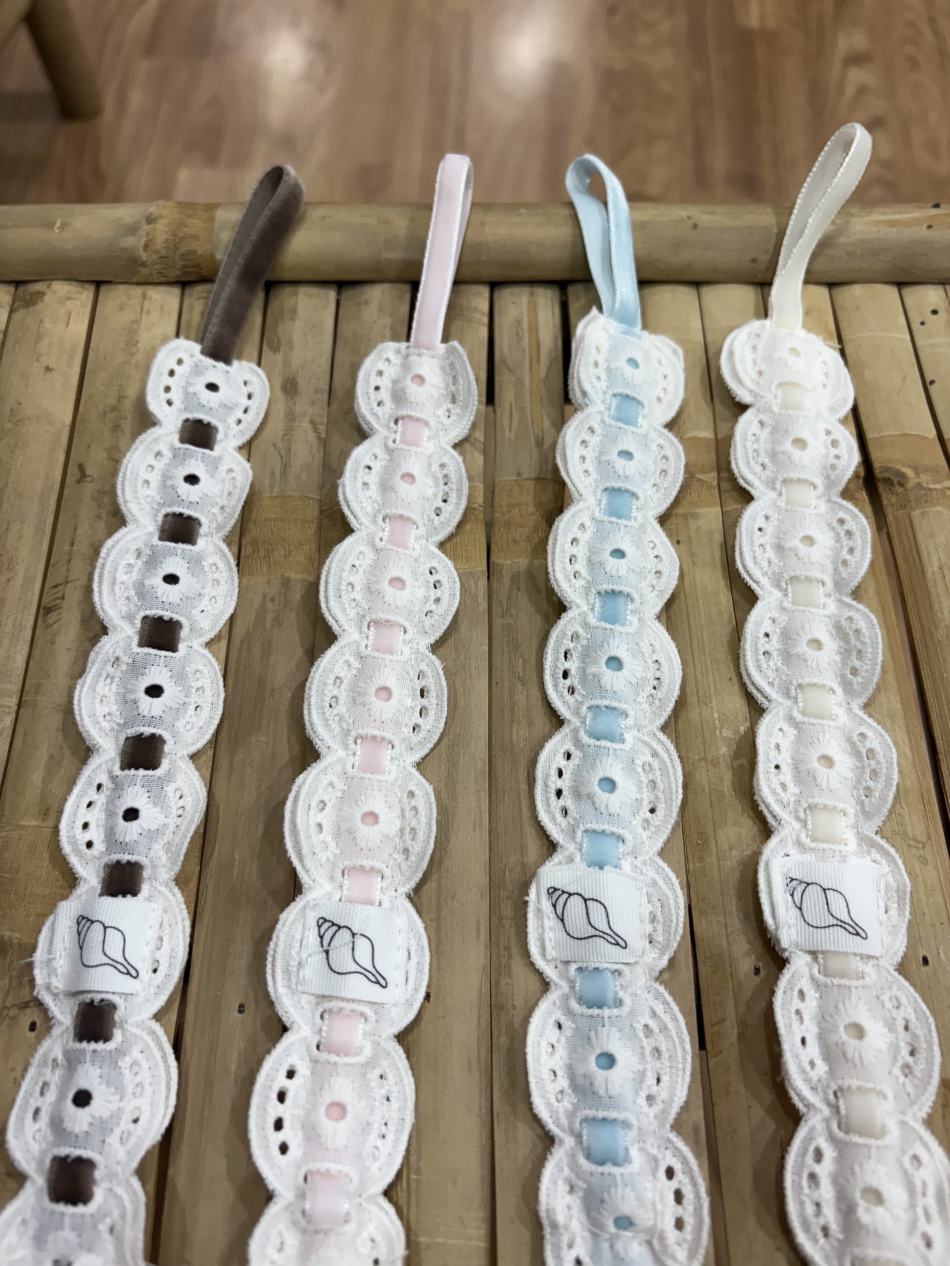 Chupetero de tira bordada blanco roto, rosa bebe, celeste y marrón.
