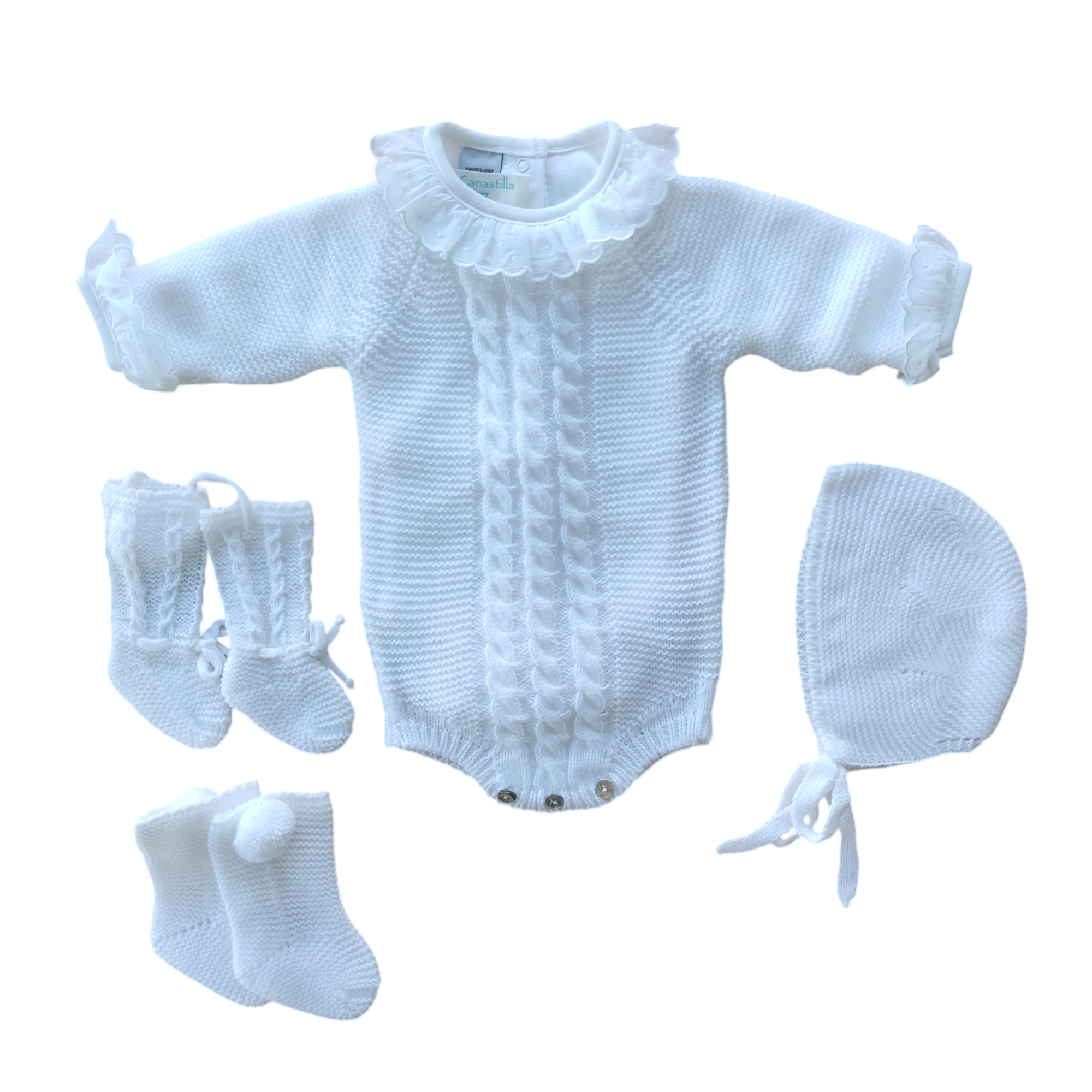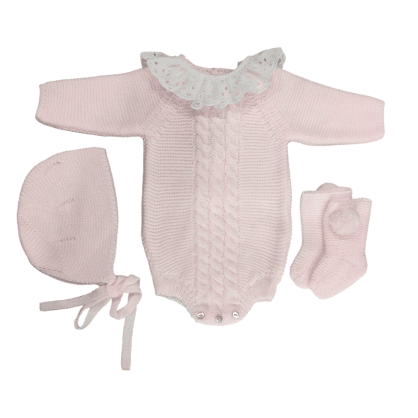 El conjunto viene con el pelele la capota y los patucos de borlón.
