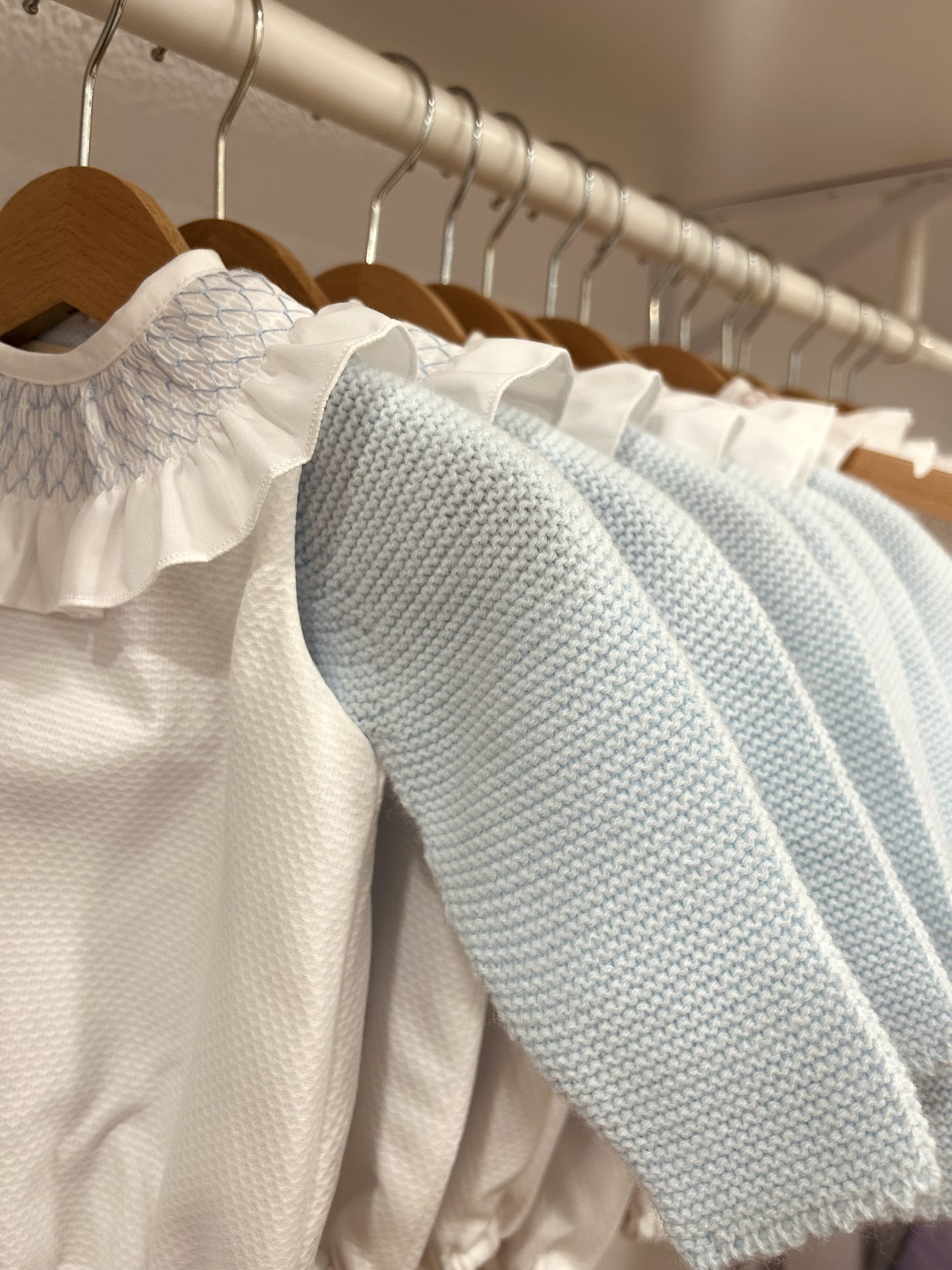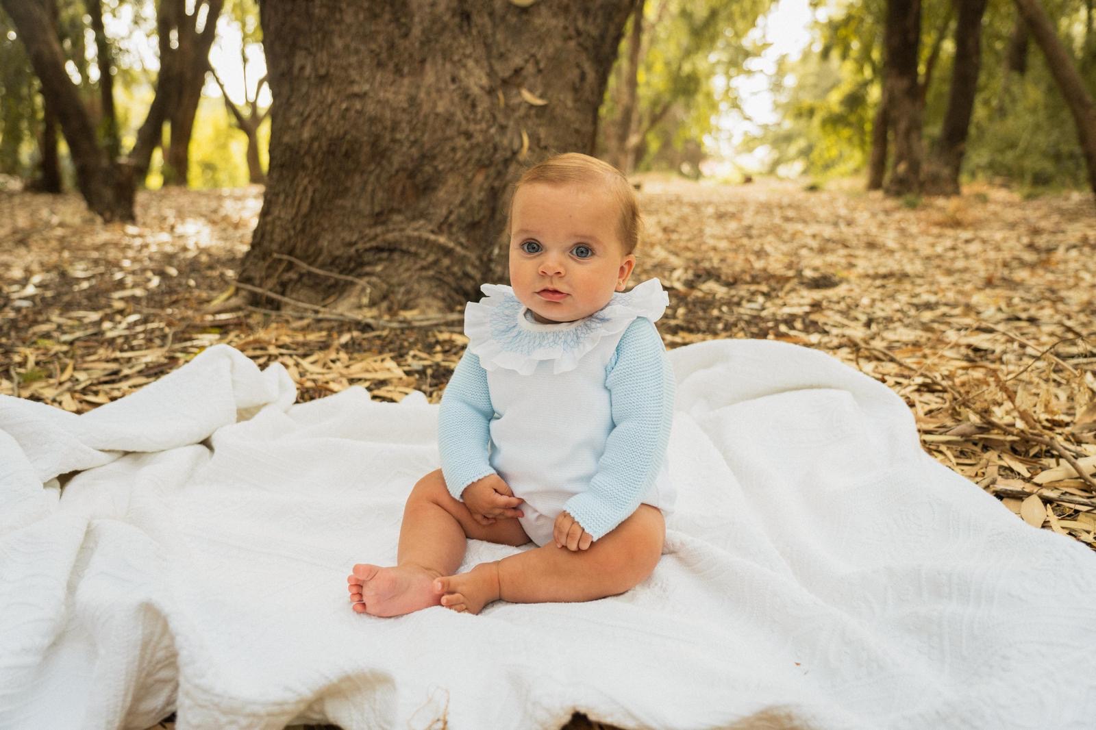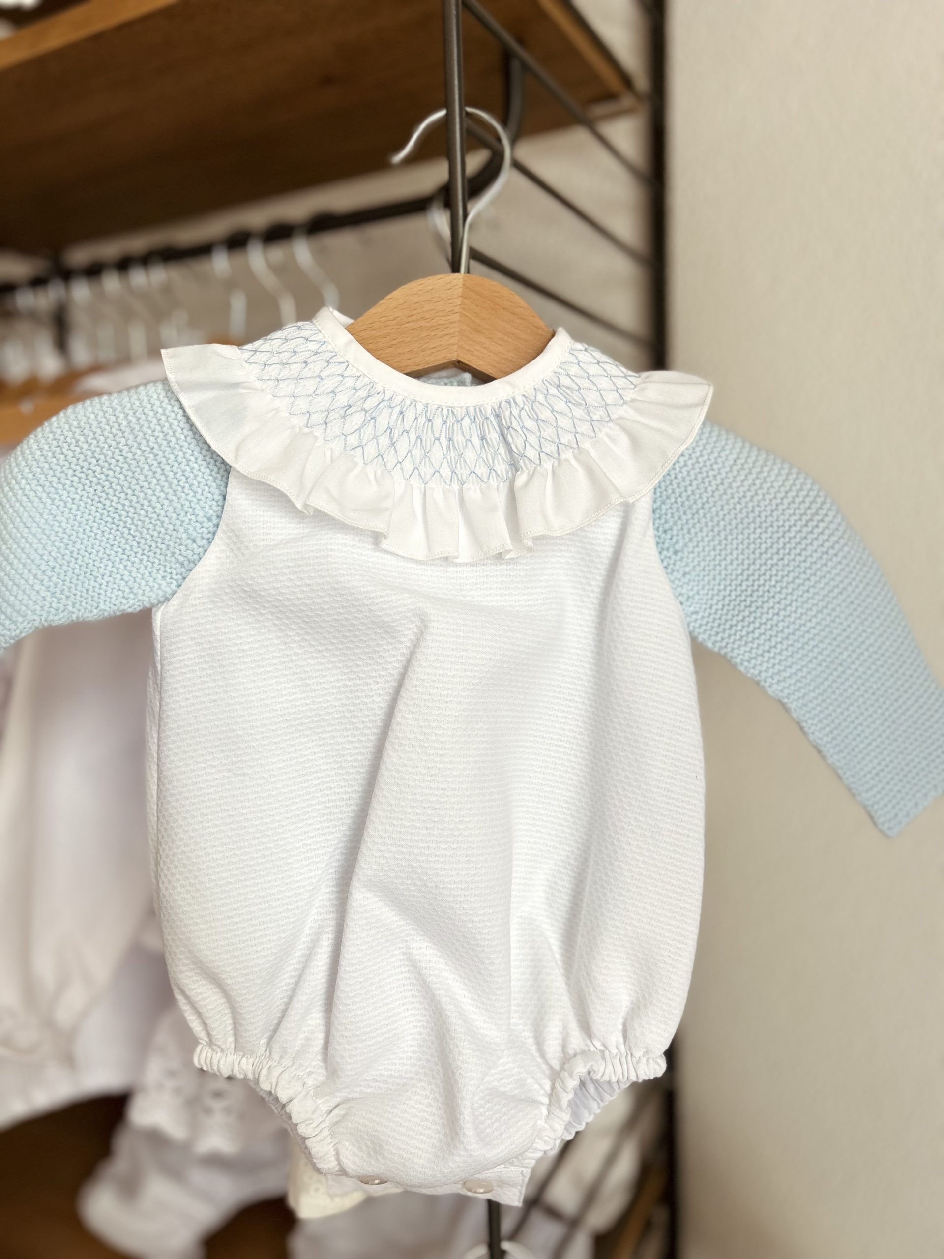 El pelele smock celeste va combinado con el jersey de lana celeste.