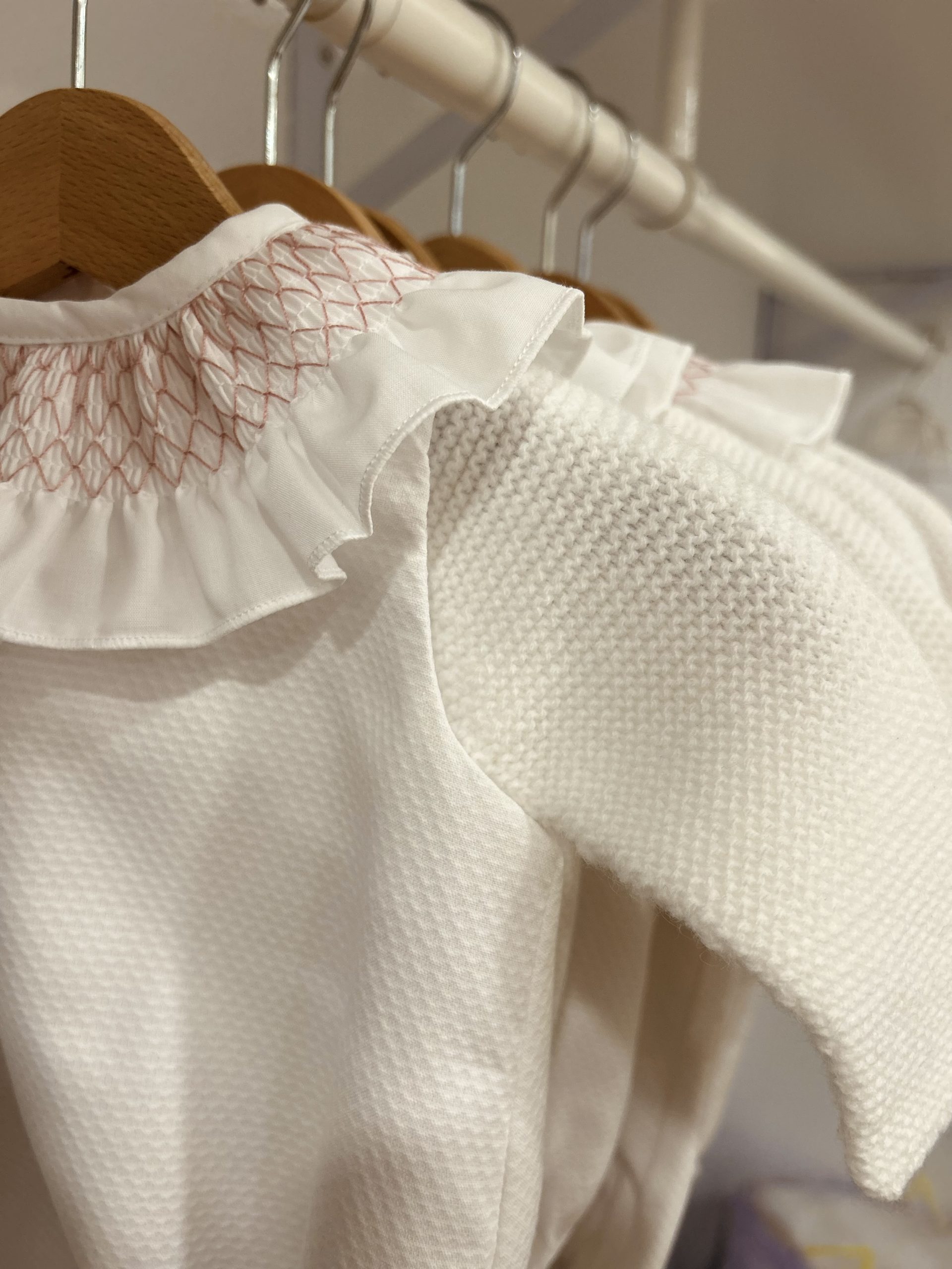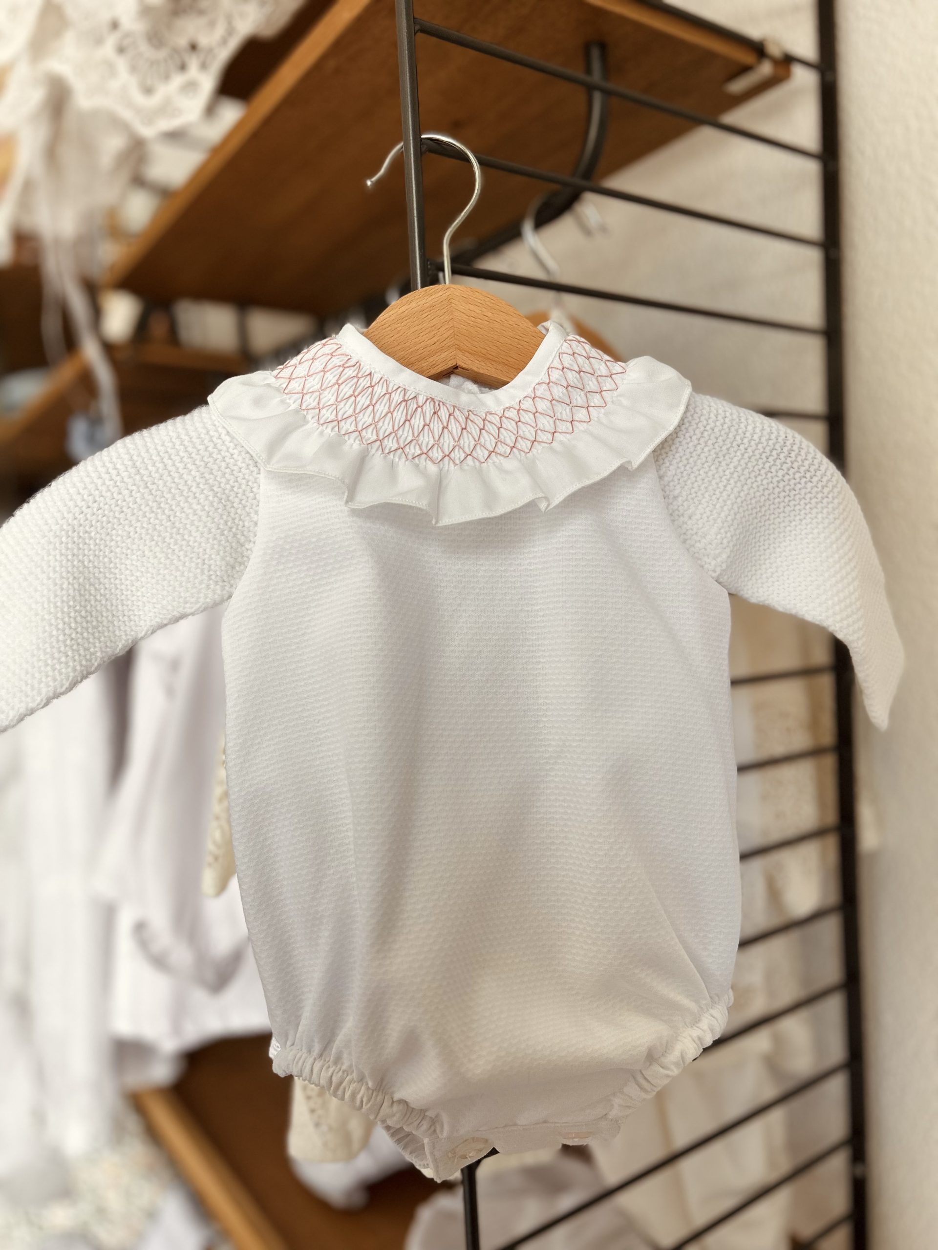 El pelele smock rosa va combinado con el jersey de lana blanco.
