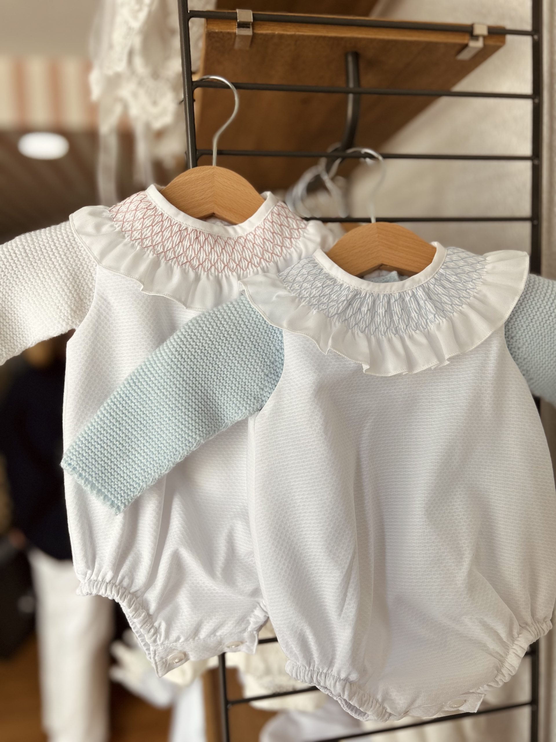 Oferta especial de pelele smock con el jersey de lana. Disponible en Rosa bebe y Celeste.