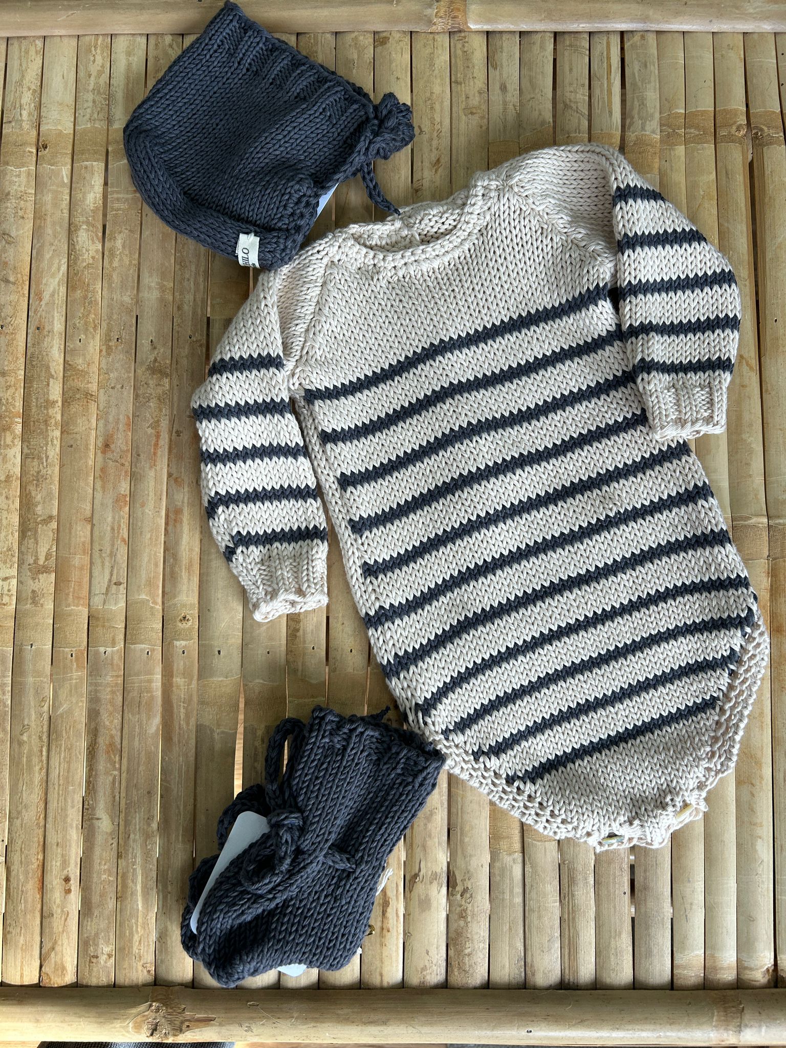 Este conjunto de punto bebé algodón 100 % destaca por su calidad, suavidad y diseño atemporal en tonos gris y blanco roto.