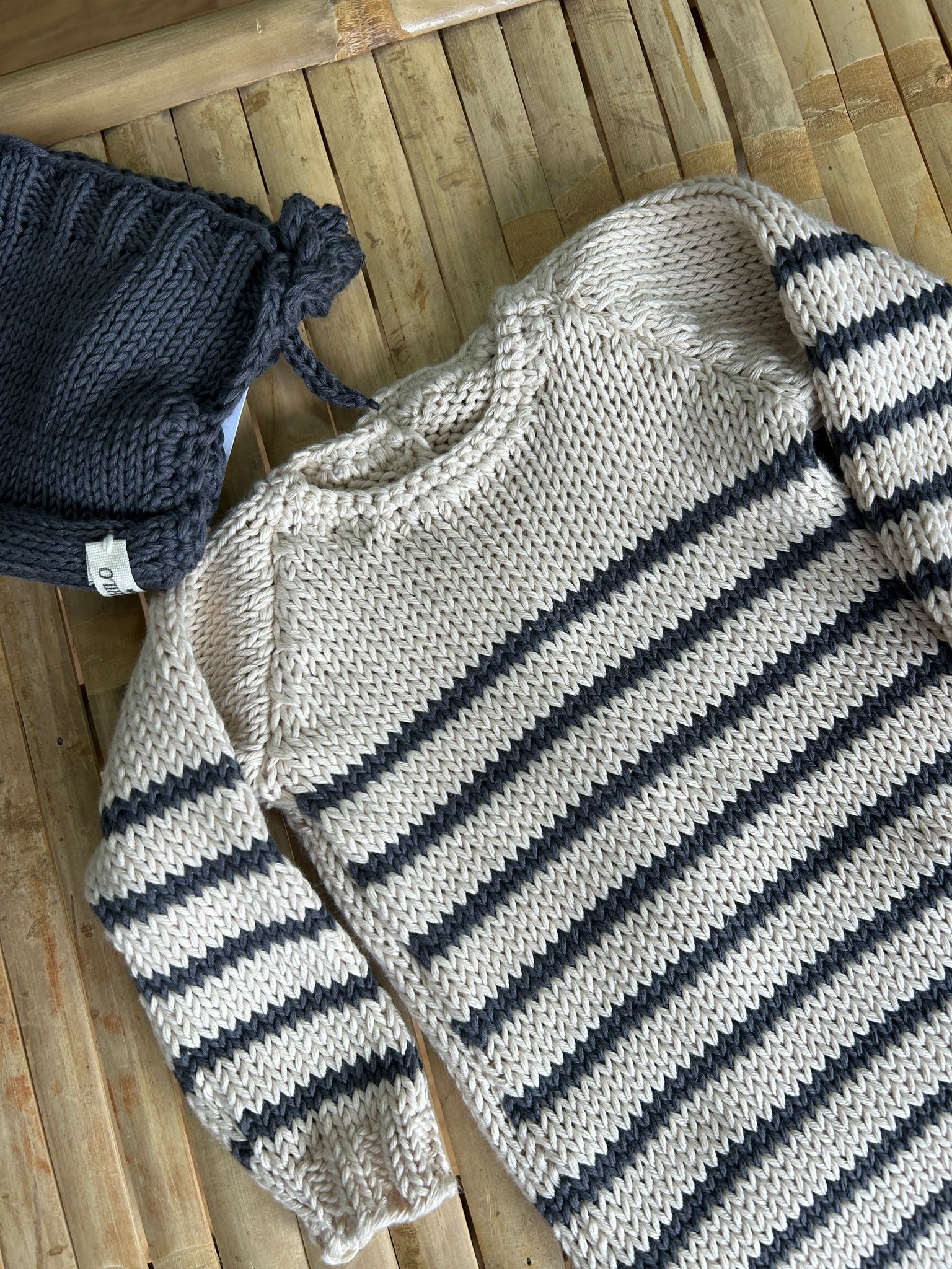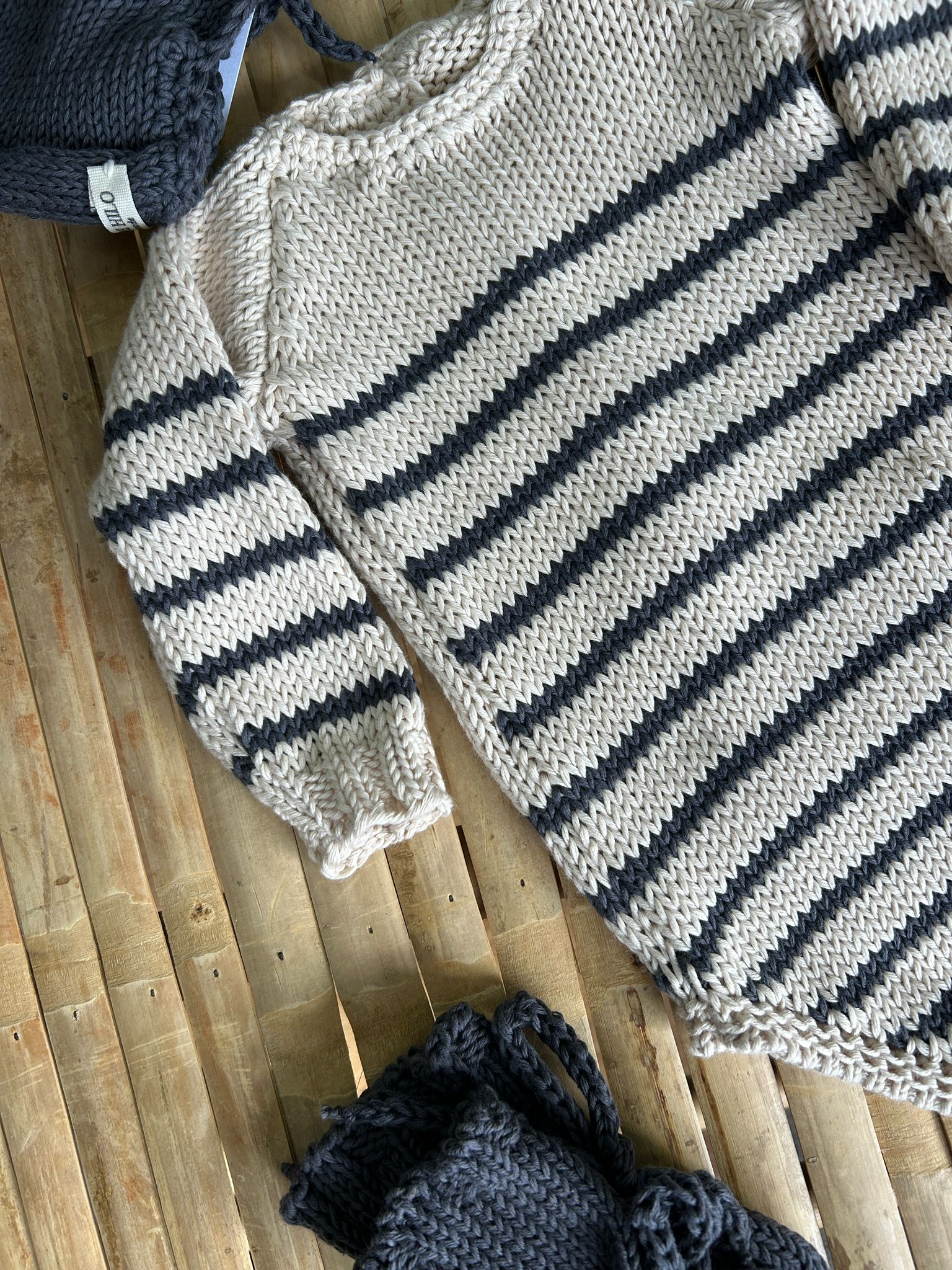 Su diseño en blanco roto con rayas en gris aporta un estilo atemporal y elegante, fácil de combinar y apto tanto para niño como para niña. El punto de algodón tiene un grosor ideal para esta temporada, ofreciendo abrigo ligero sin resultar pesado, lo que lo convierte en una opción muy versátil para interior y exterior.