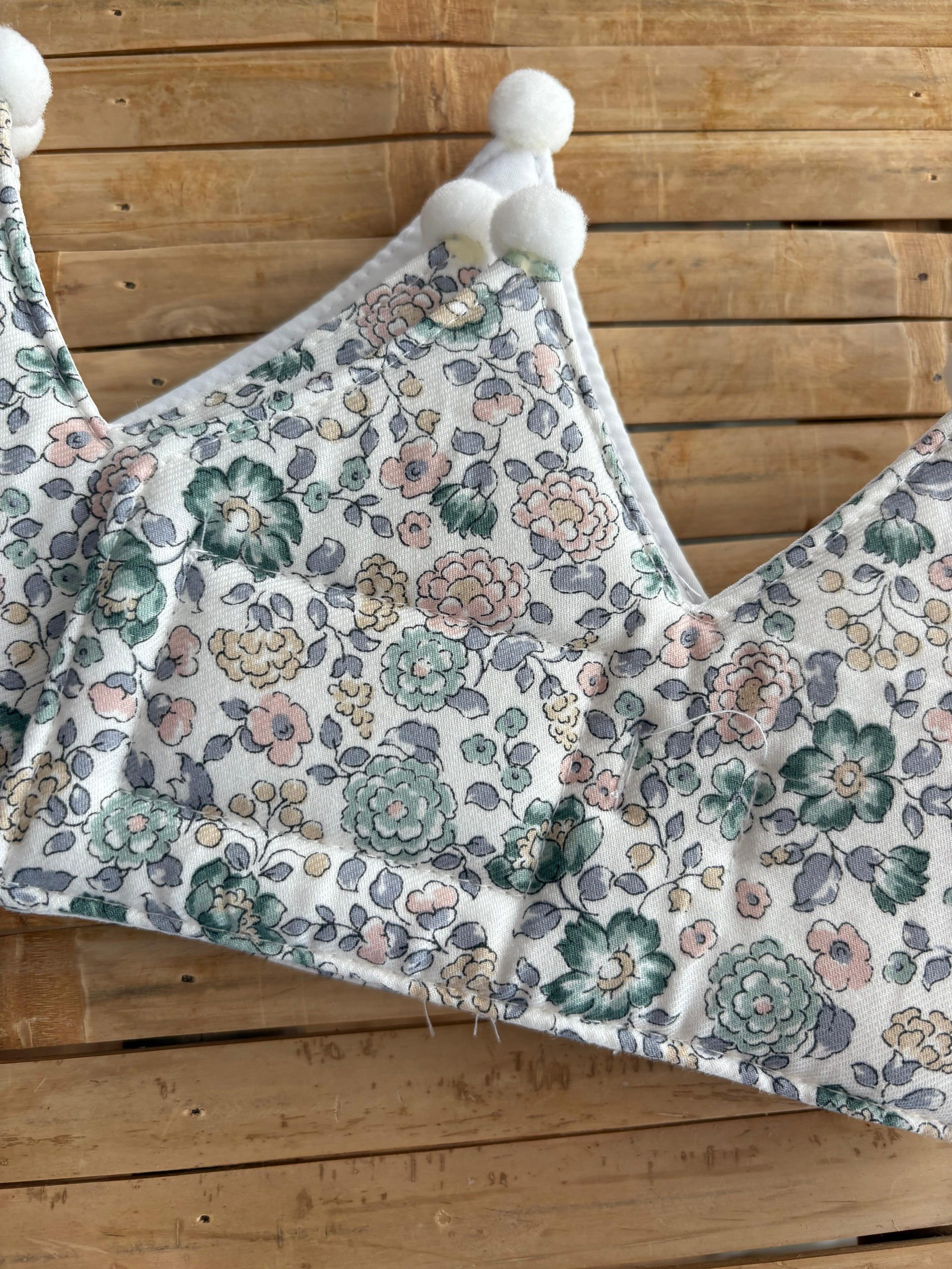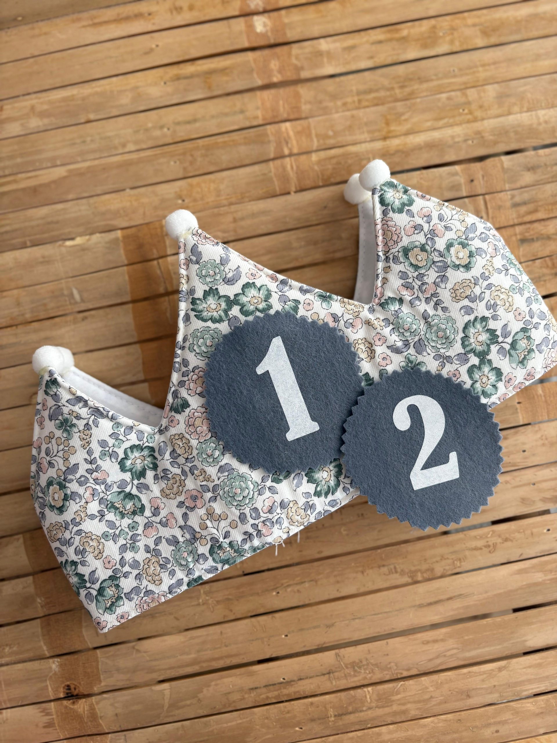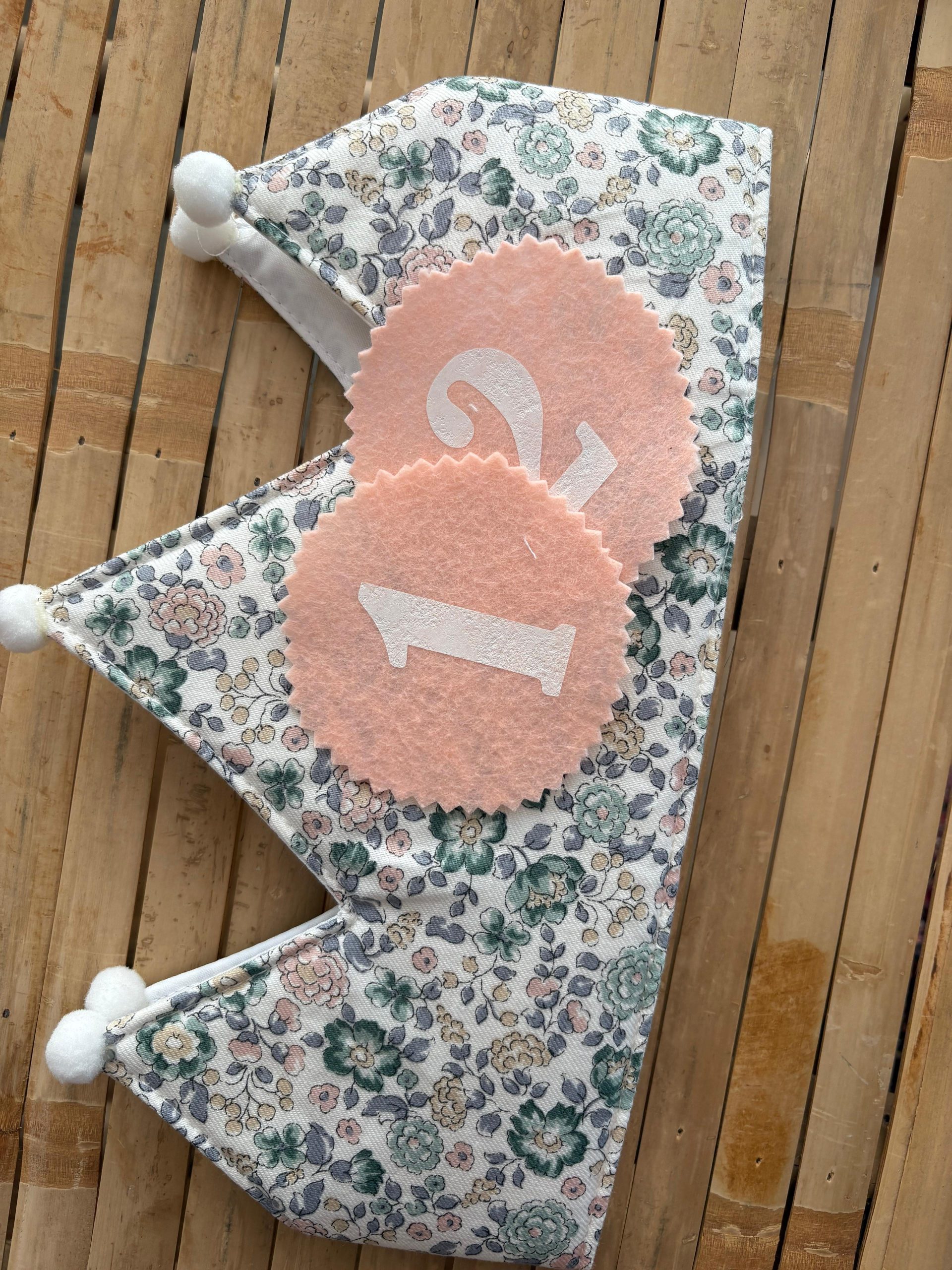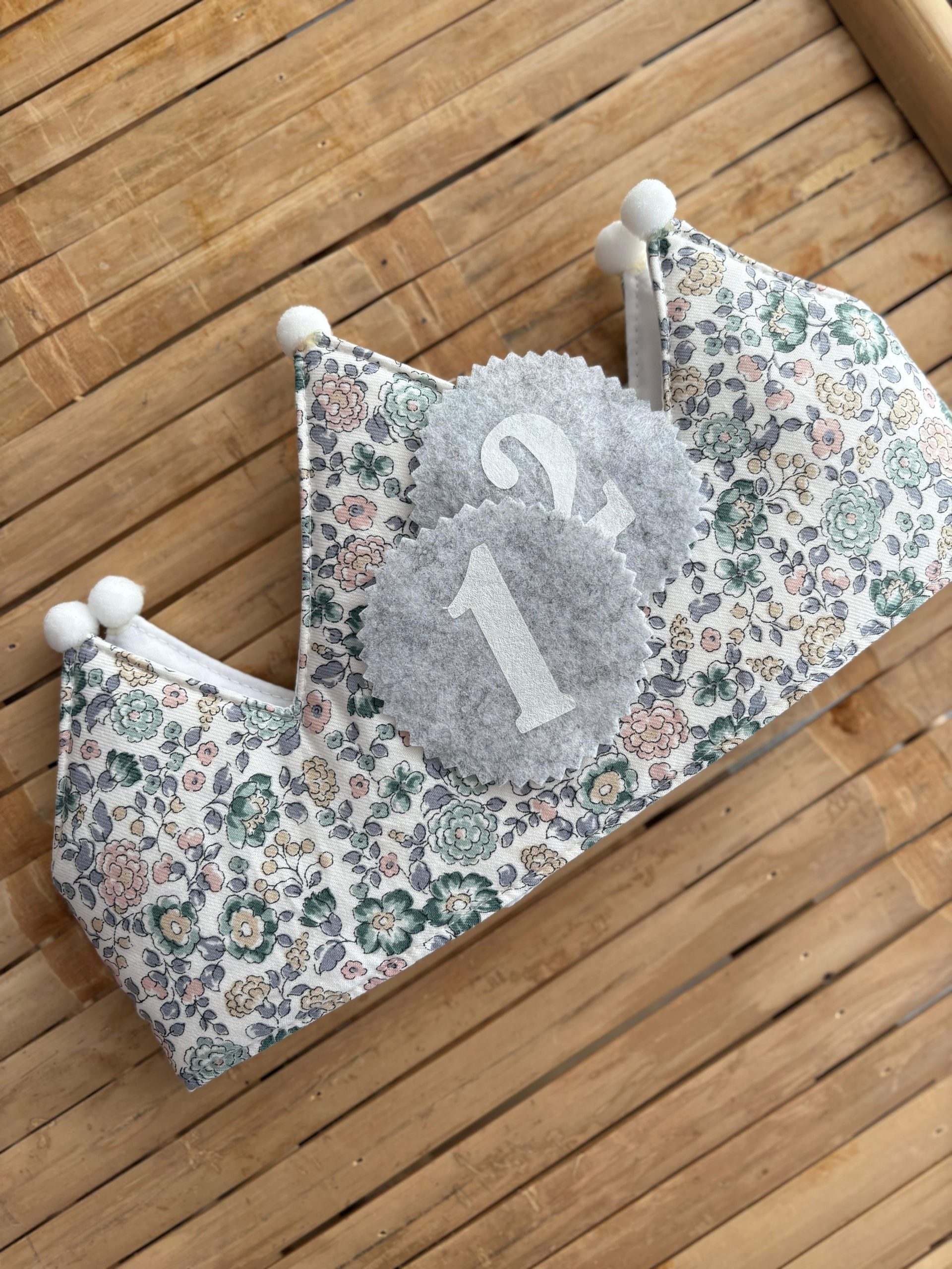 Corona de cumpleaños confeccionadas con tela de flores unisex. Se cierra con velcro.