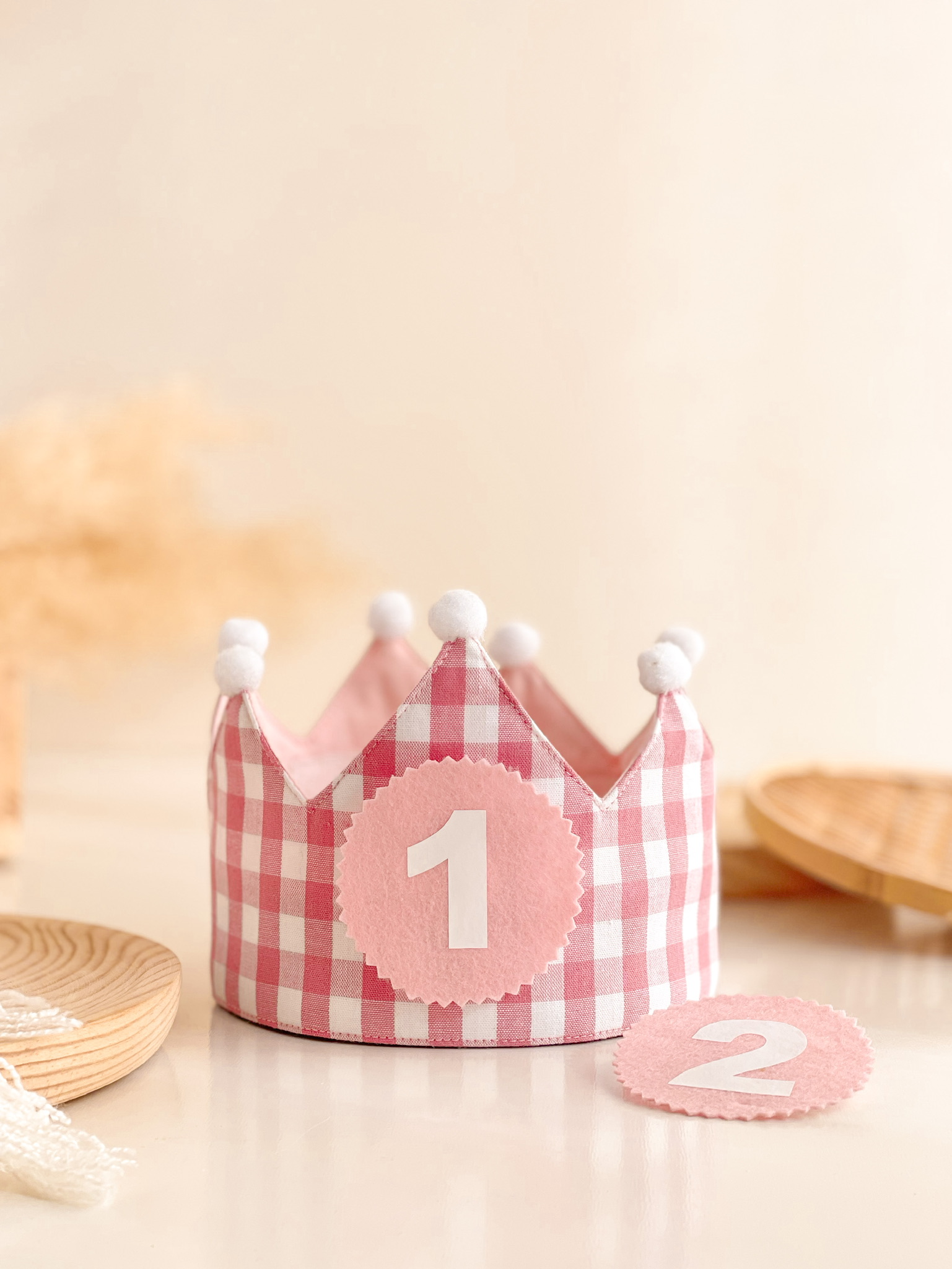 Haz que el cumpleaños de tu peque sea mágico con esta corona de cumpleaños personalizada, hecha 100% a mano con tela de algodón orgánico. Su estampado Vichy y los distintos colores disponibles permiten elegir la opción perfecta para combinar con cualquier celebración, creando un look adorable y único para los pequeños terremotos de la casa.