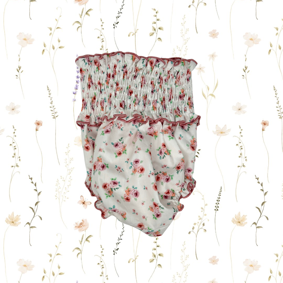 Culetín estampado flores, con tira bordada en el filo superior. Esta prenda o sirve desde priera puesta, queda un poco más altito en el bebé y al disponer de hilo elástico lo podéis utilizar hasta los 12 meses ya que no se clava nada.