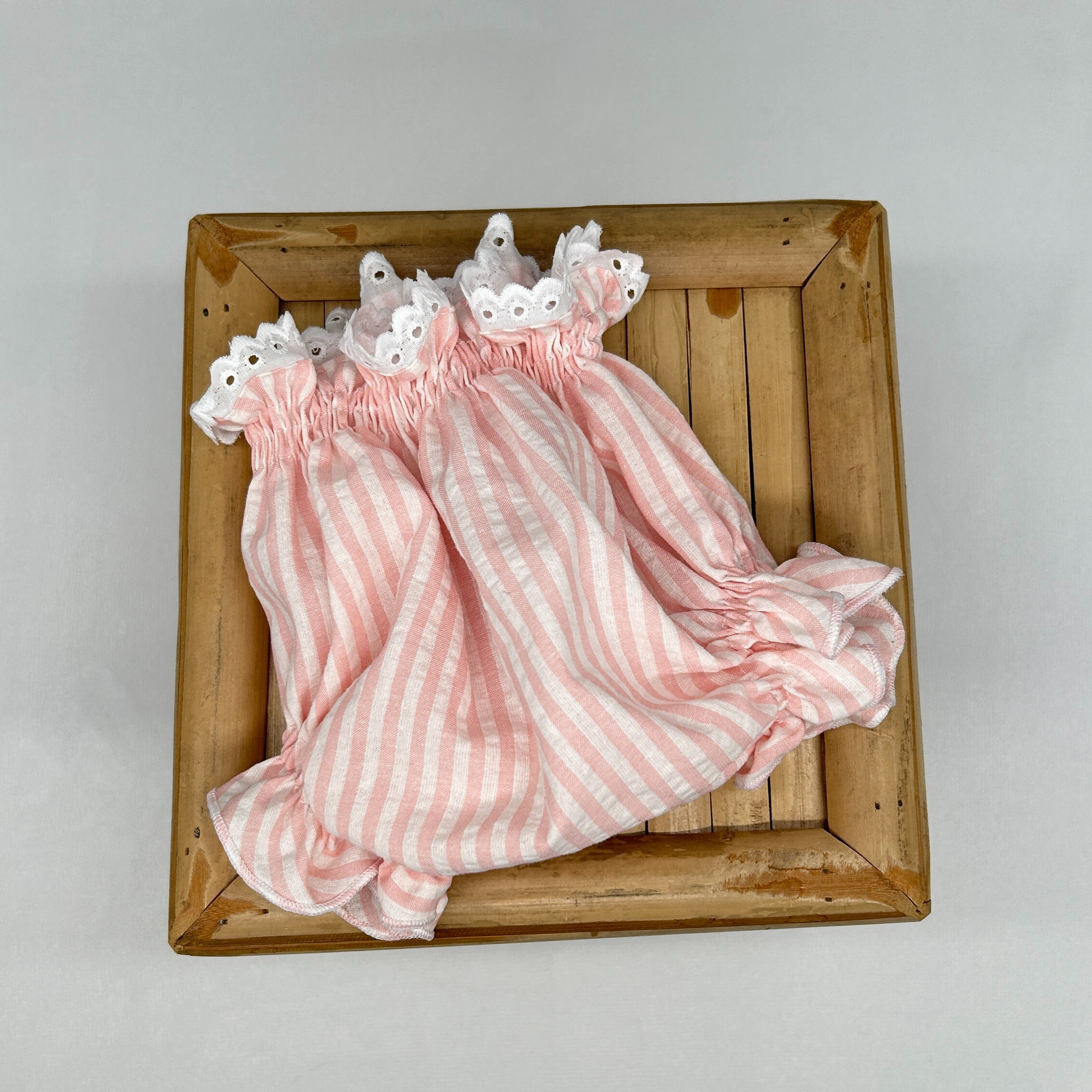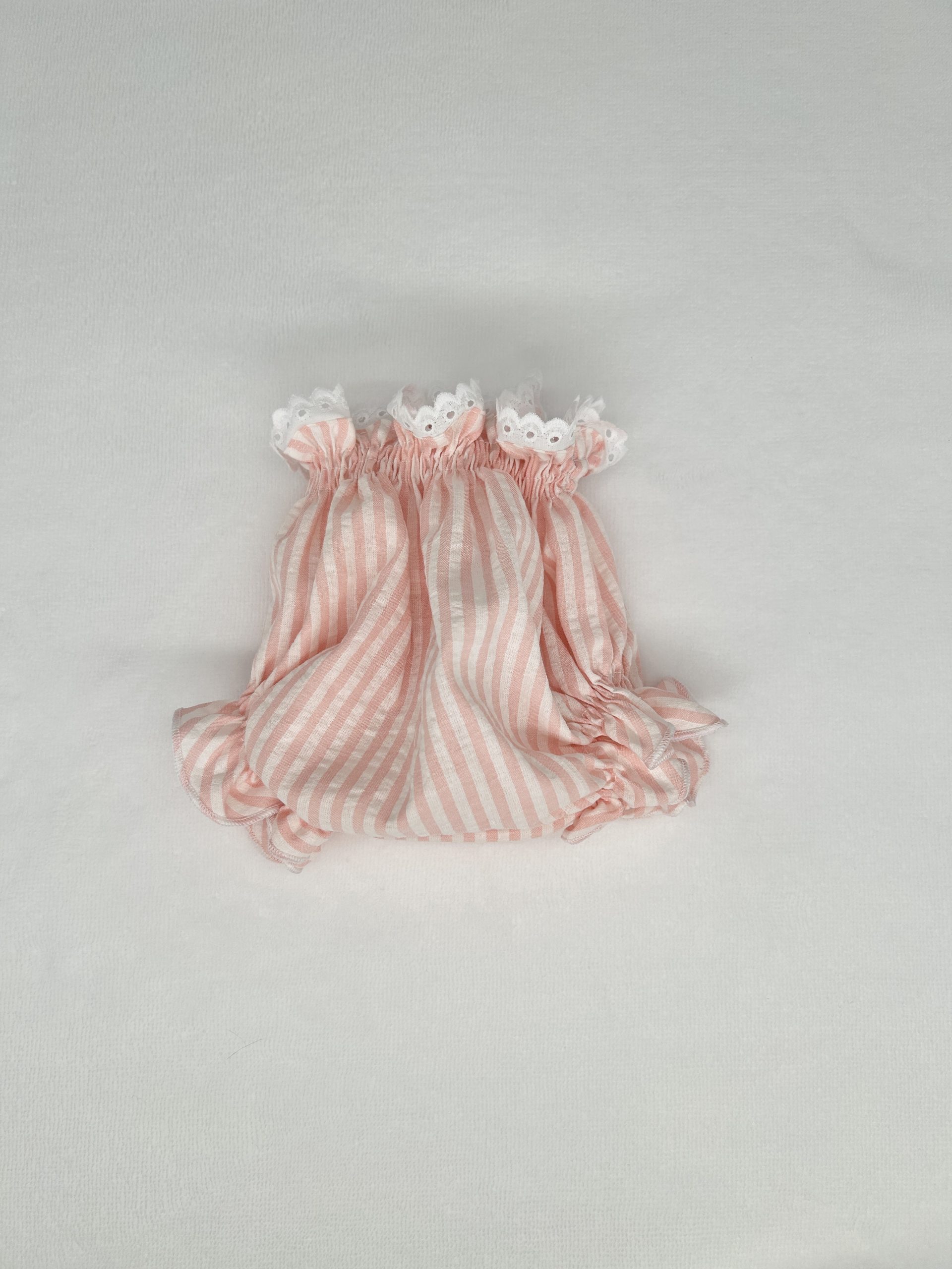 Culetín de rayas rosa, con tira bordada en el filo superior. Esta prenda o sirve desde priera puesta, queda un poco más altito en el bebé y al disponer de hilo elástico lo podéis utilizar hasta los 12 meses ya que no se clava nada.
