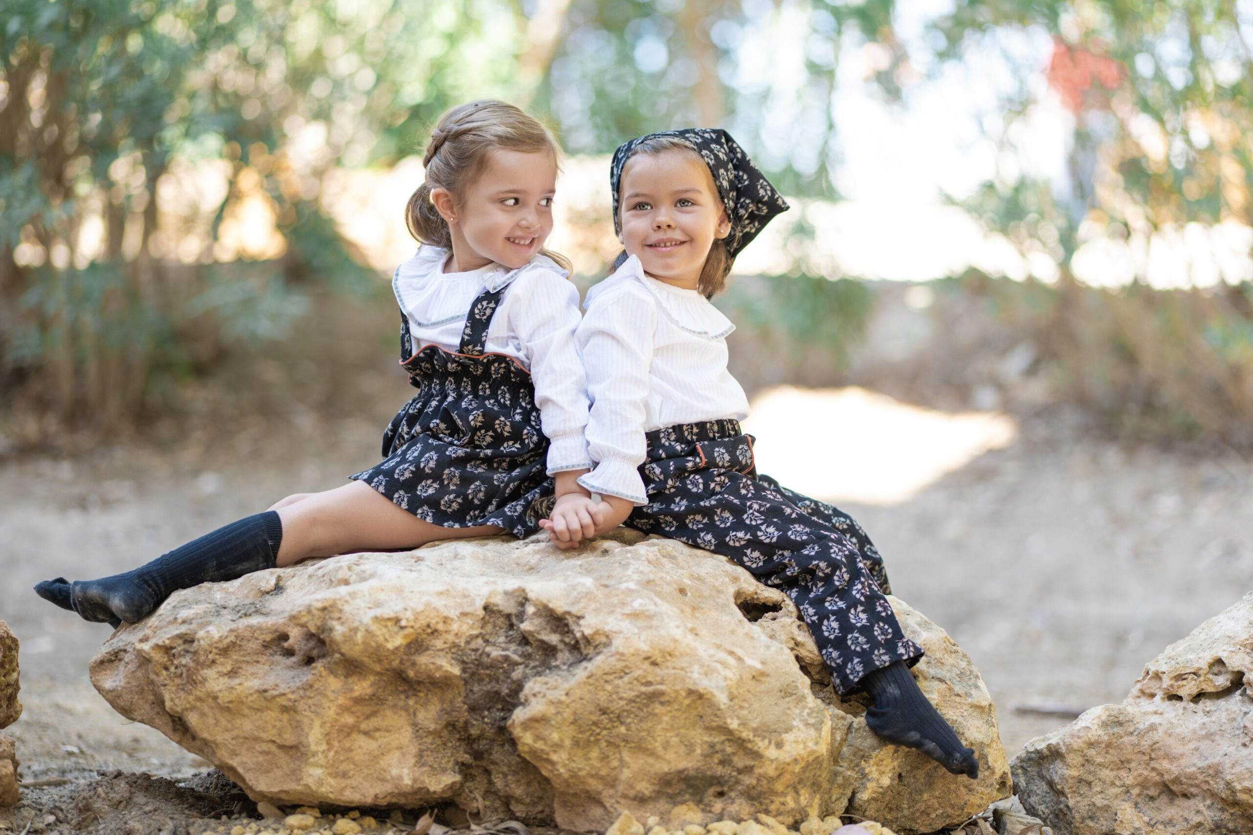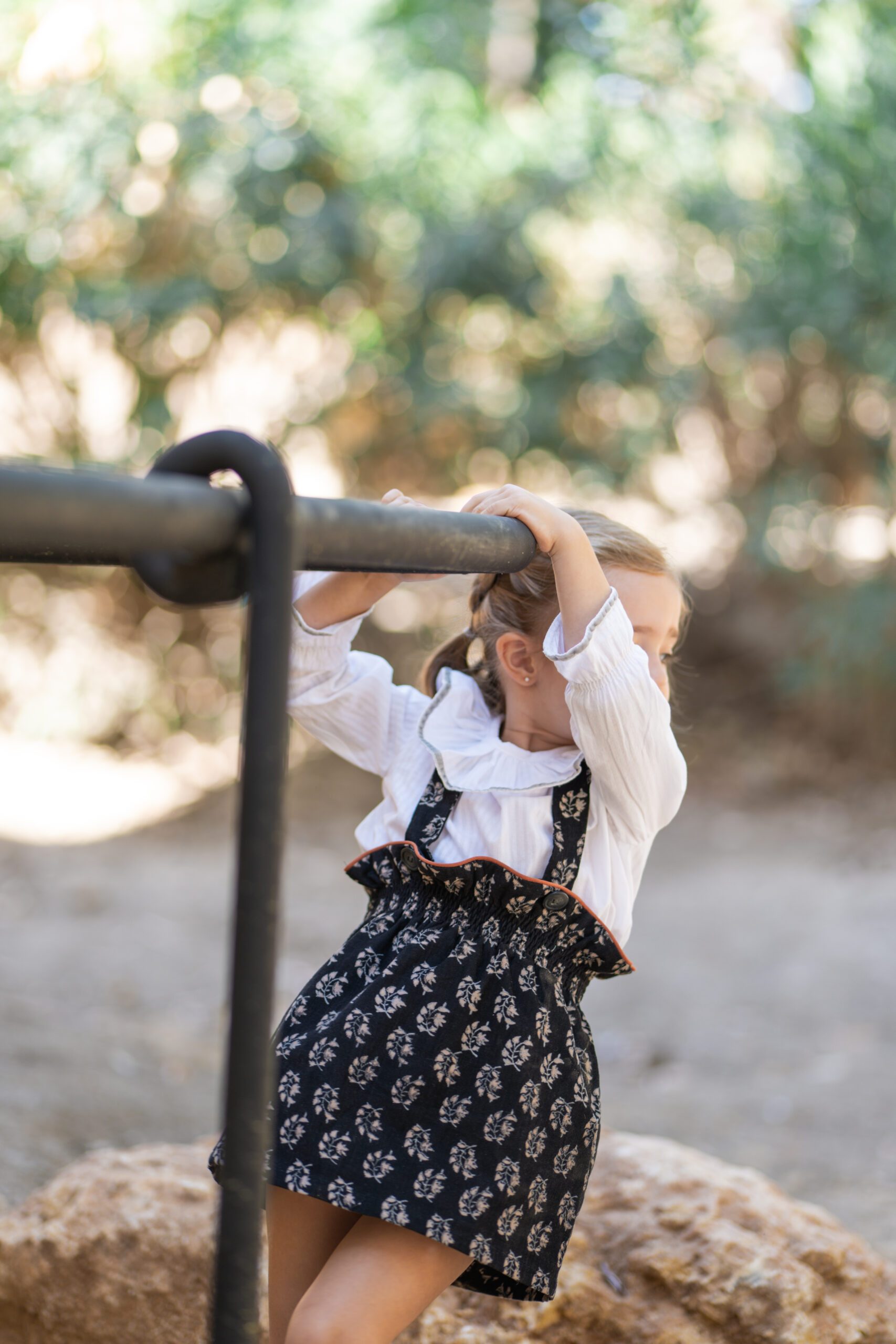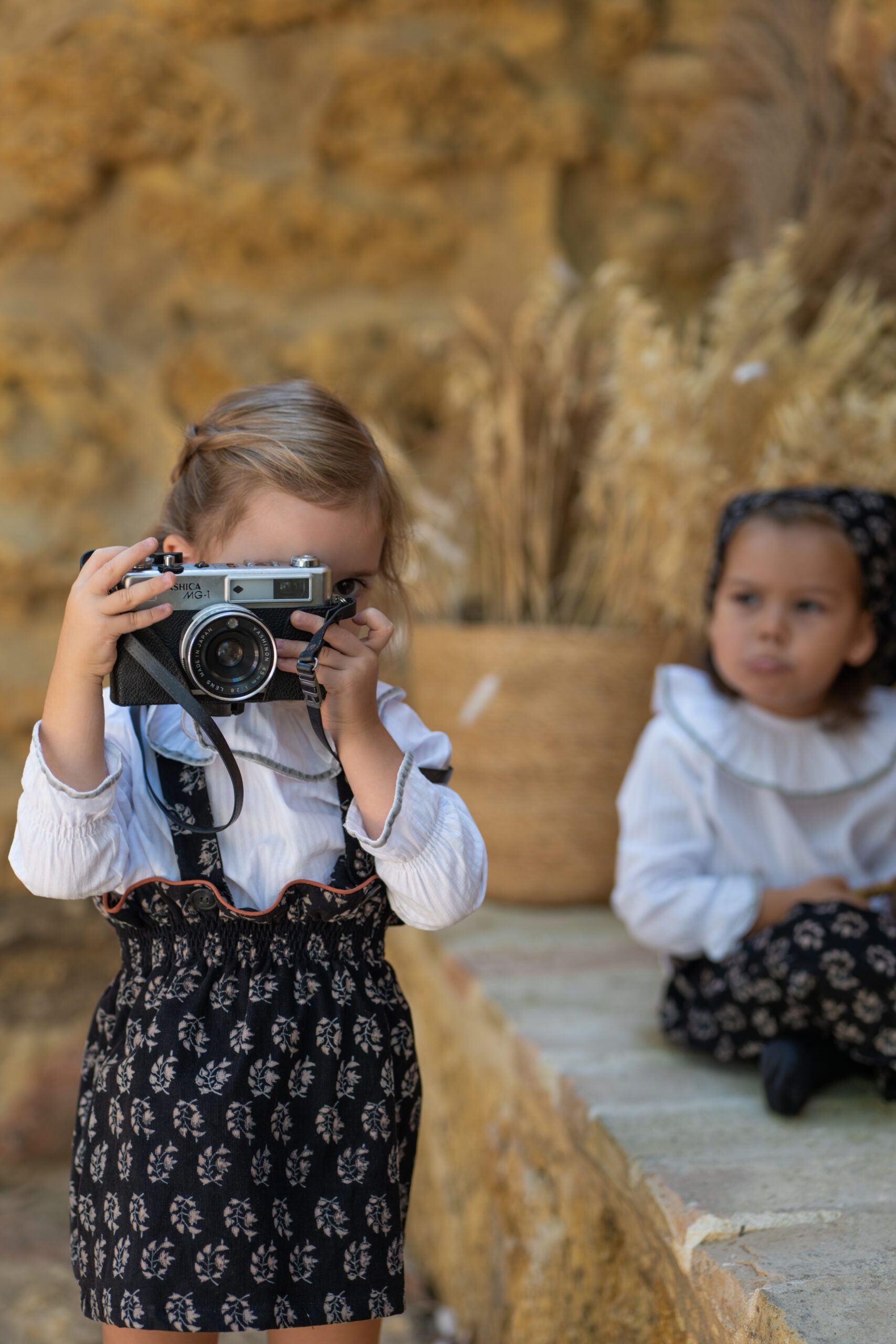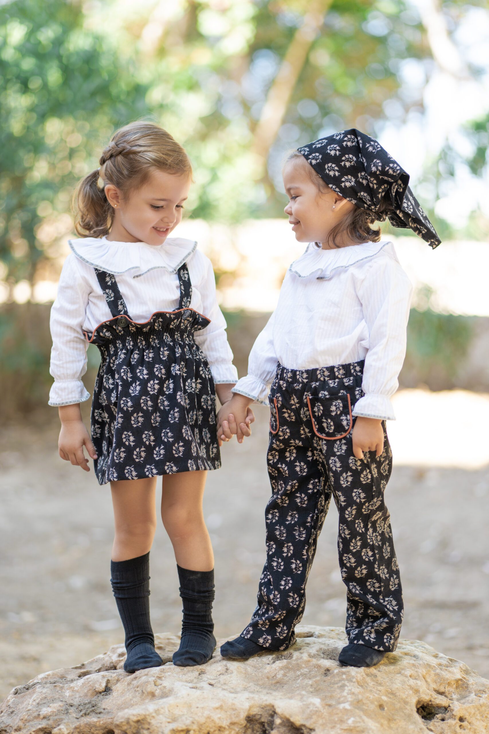 Falda con cintura elástica de pana menta para niña, con bolsillos delanteros en tejido floral y detalle de ondulina azul marino. Disponible en tallas 2-3 y 4-5 años.