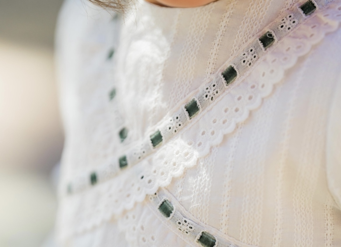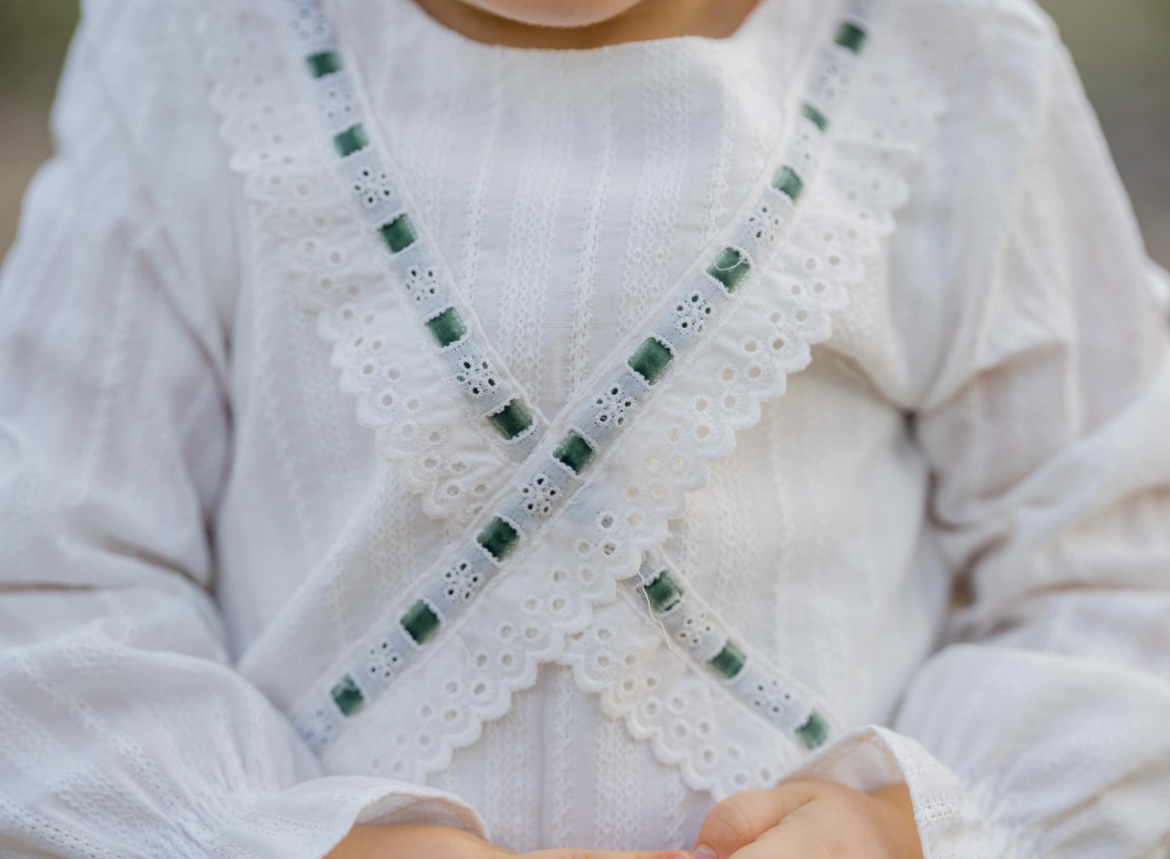 Jesusito bordado con pecherín con tira bordada en cruz y pasacinta disponible en verde, rosa y azul.