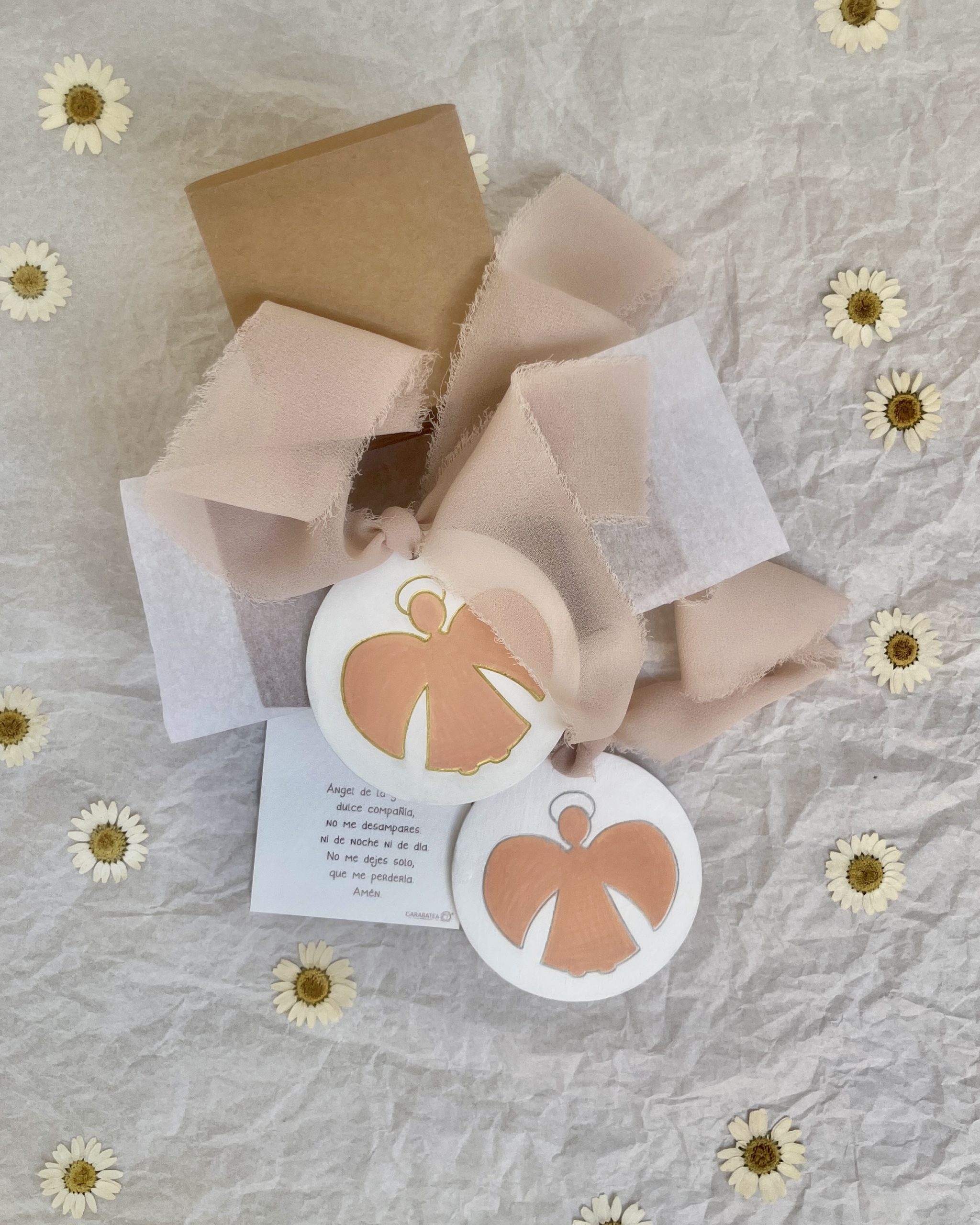 Medallón de cuna realizado en madera de forma completamente artesanal. Desde el diseño del angelito, original de Garabatea Design, hasta el grabado sobre la madera y el aplique del color mediante pintura y el lazo de seda natural con borde deshilachado… todo está realizado por nosotros pieza a pieza!