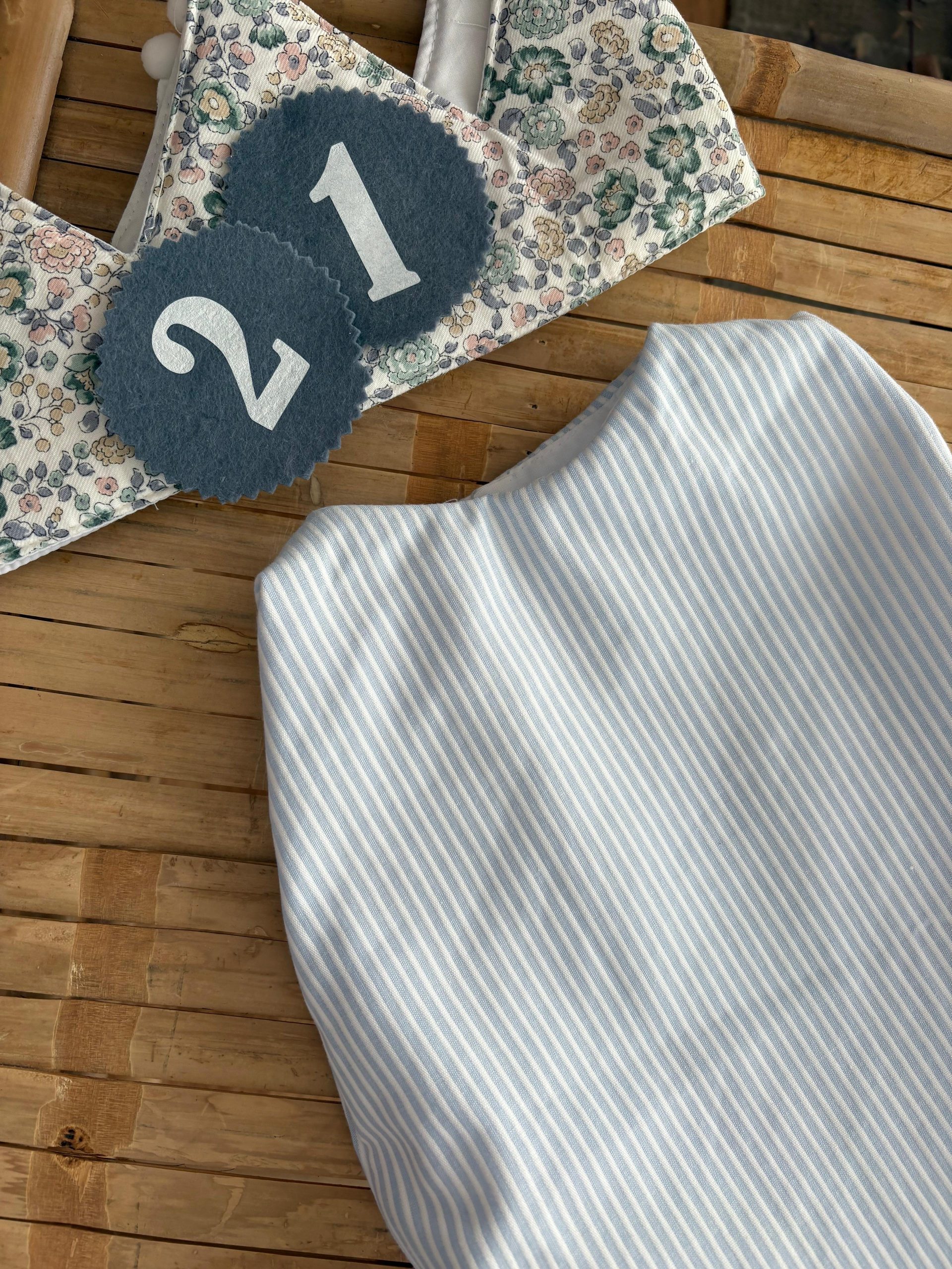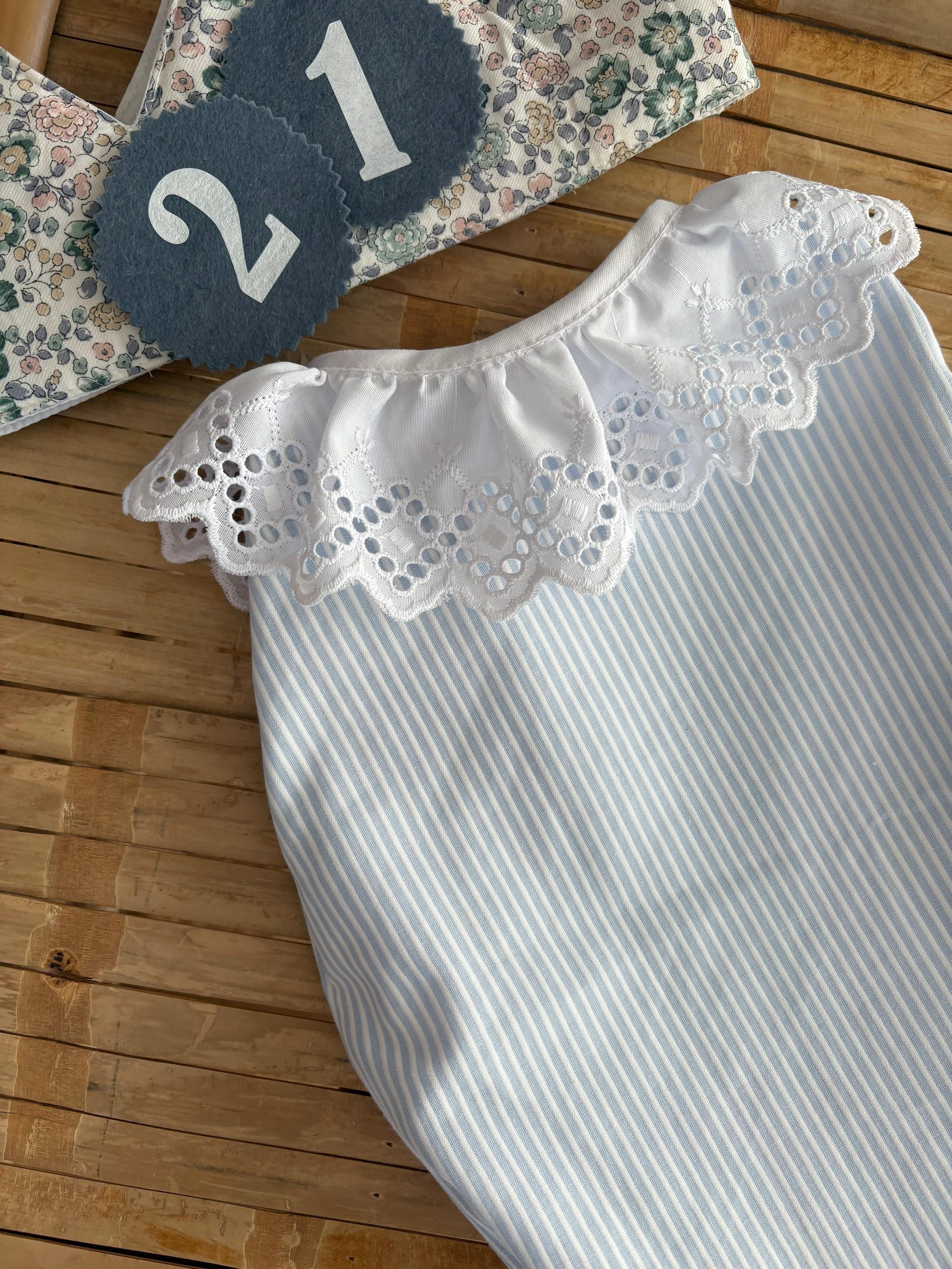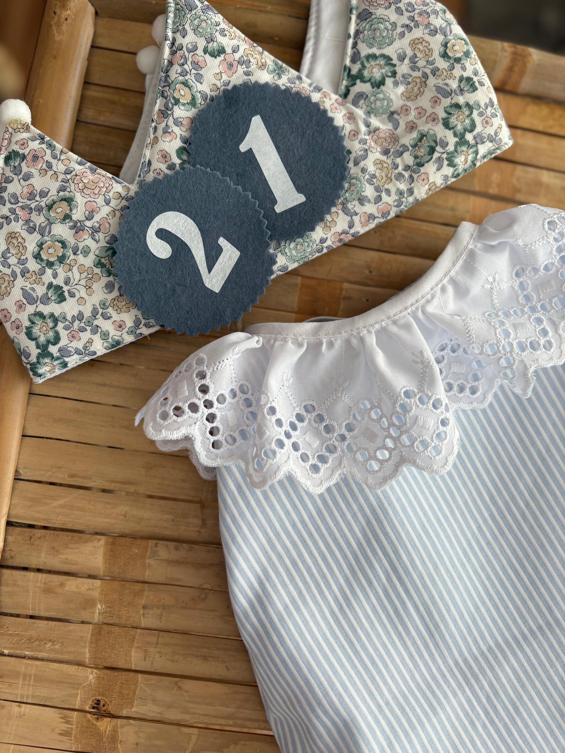 Pack perfecto para primer y segundo cumple incluye corona de flores con los dos números y pelele en rayas celeste y blanco, forrado y botones nácar abajo.