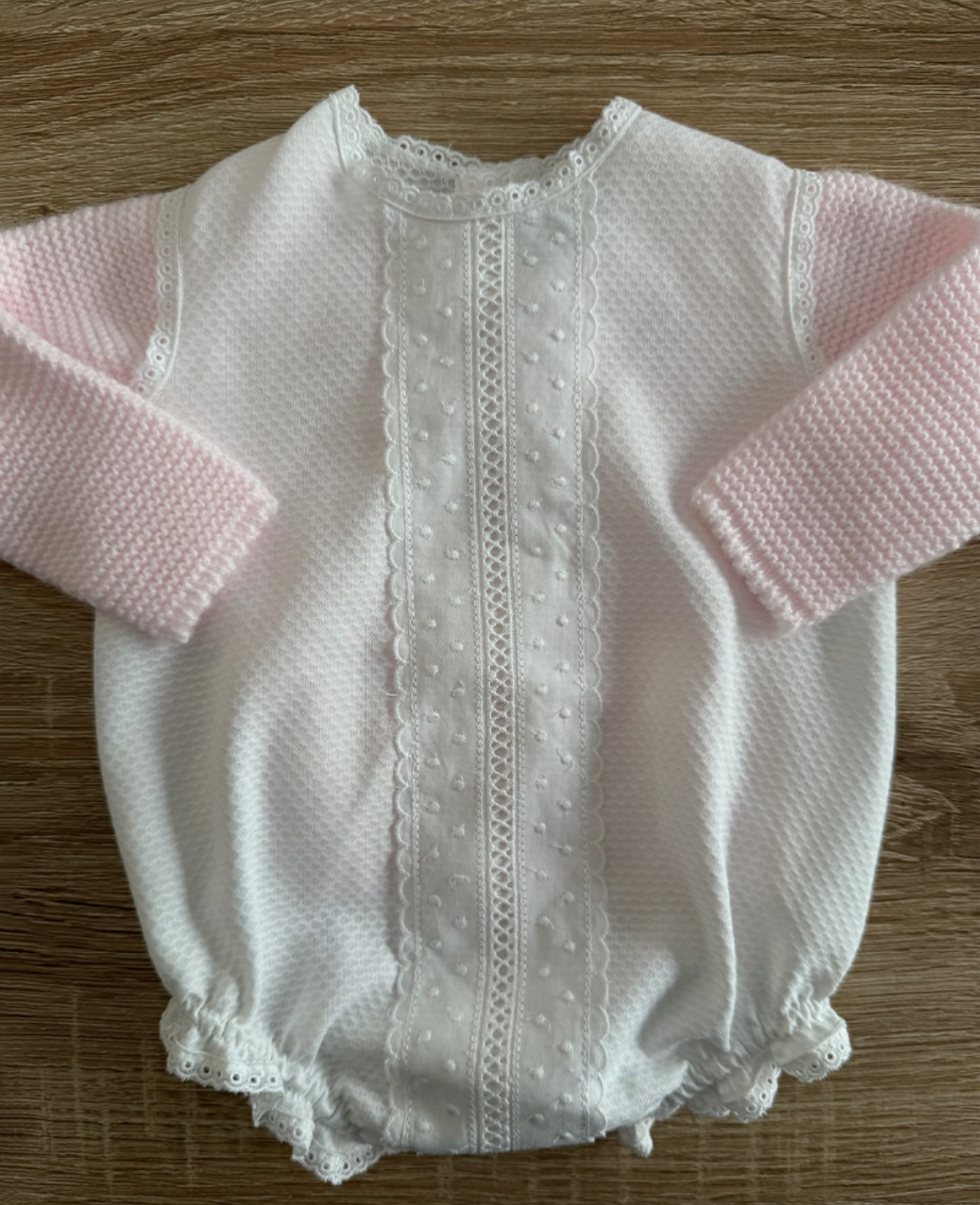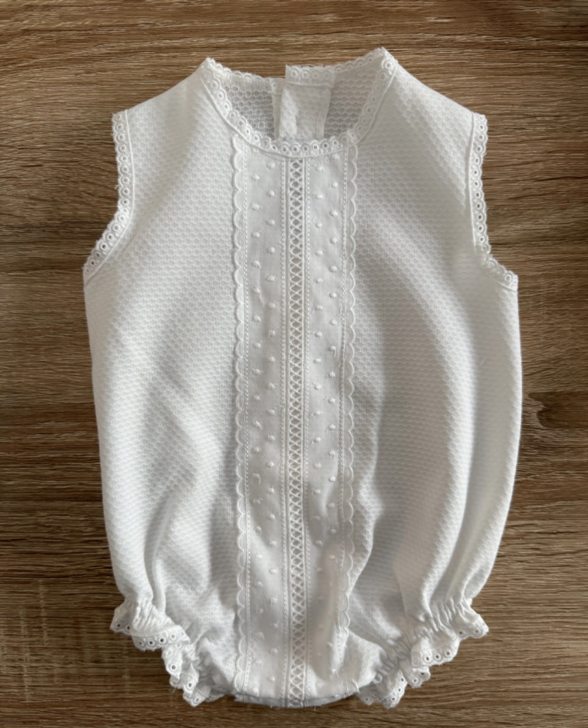 pelele confeccionado de tejido de pique y tiene botones detrás para abrir y cerrarlo.