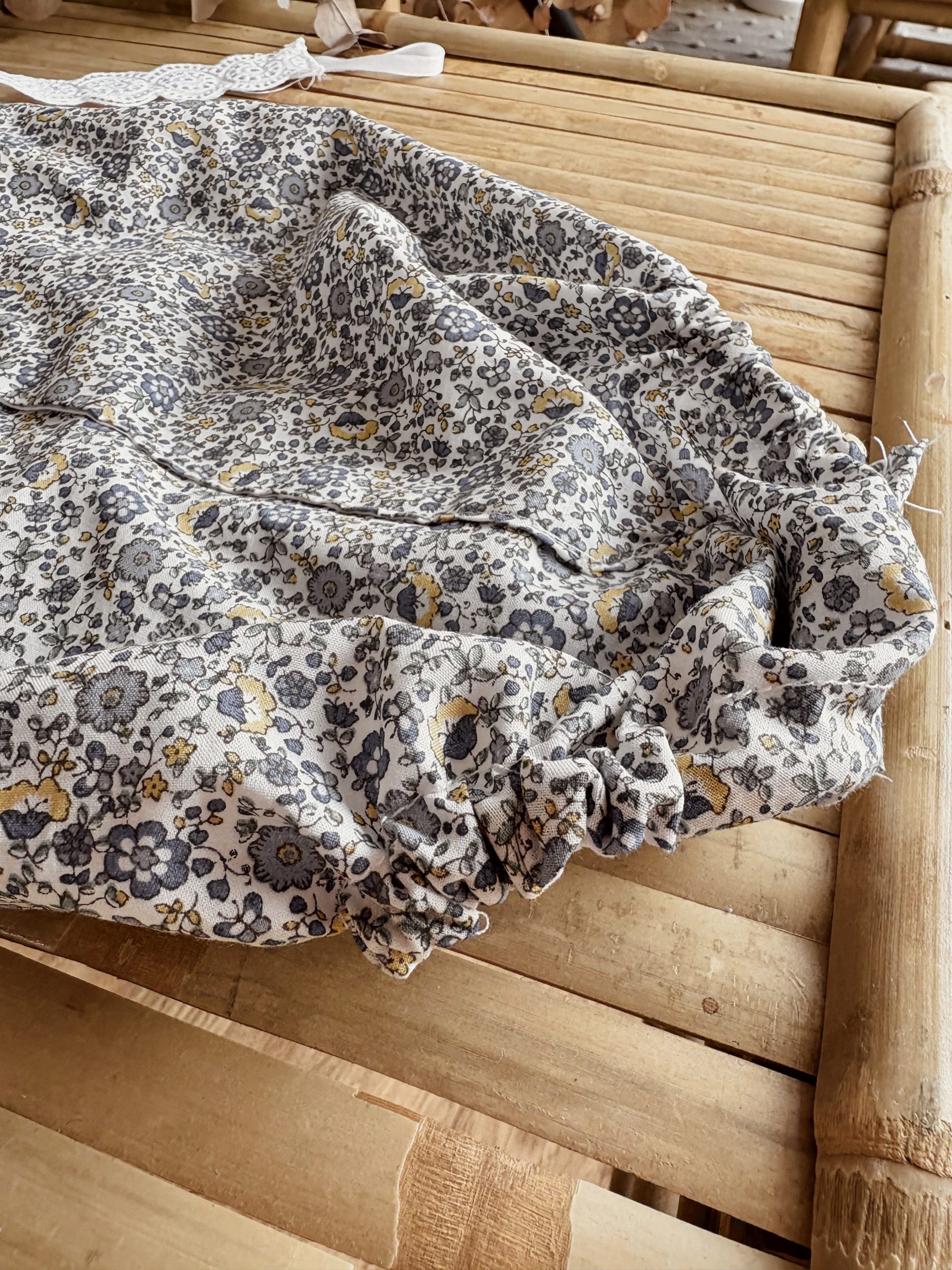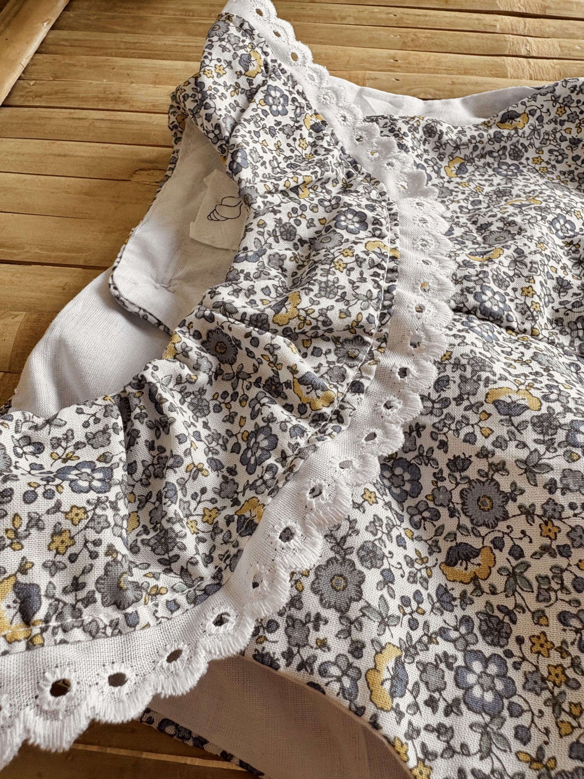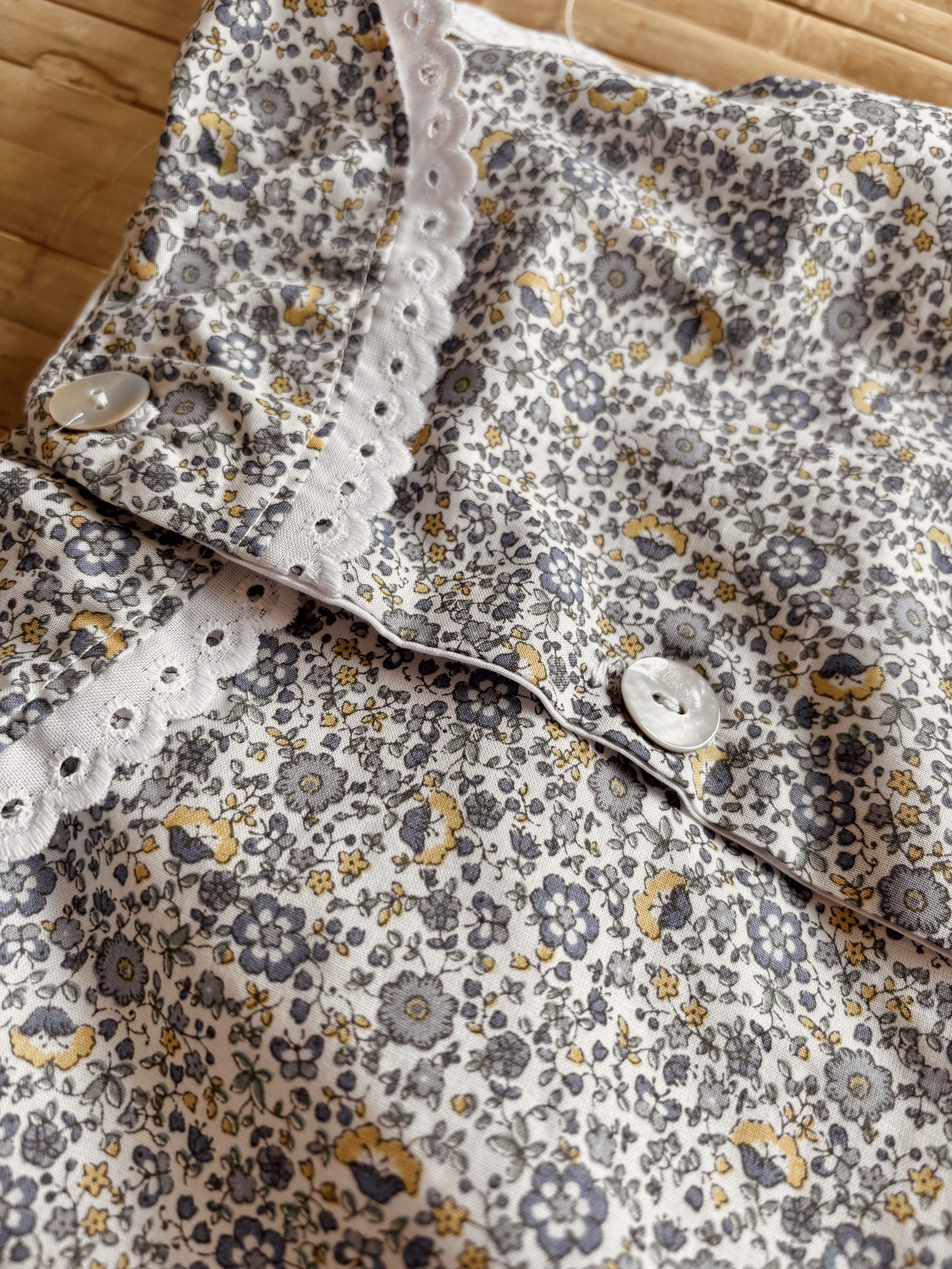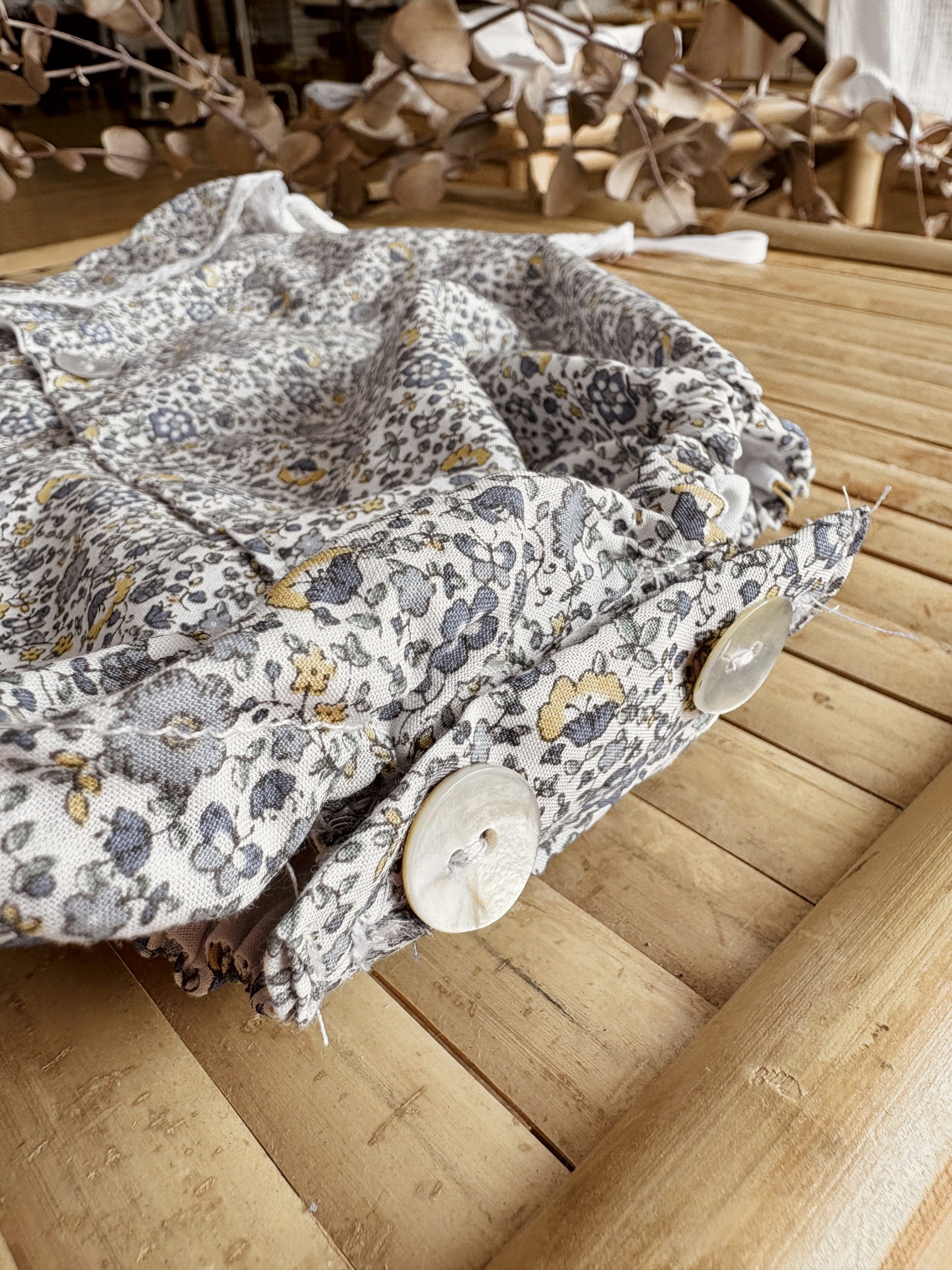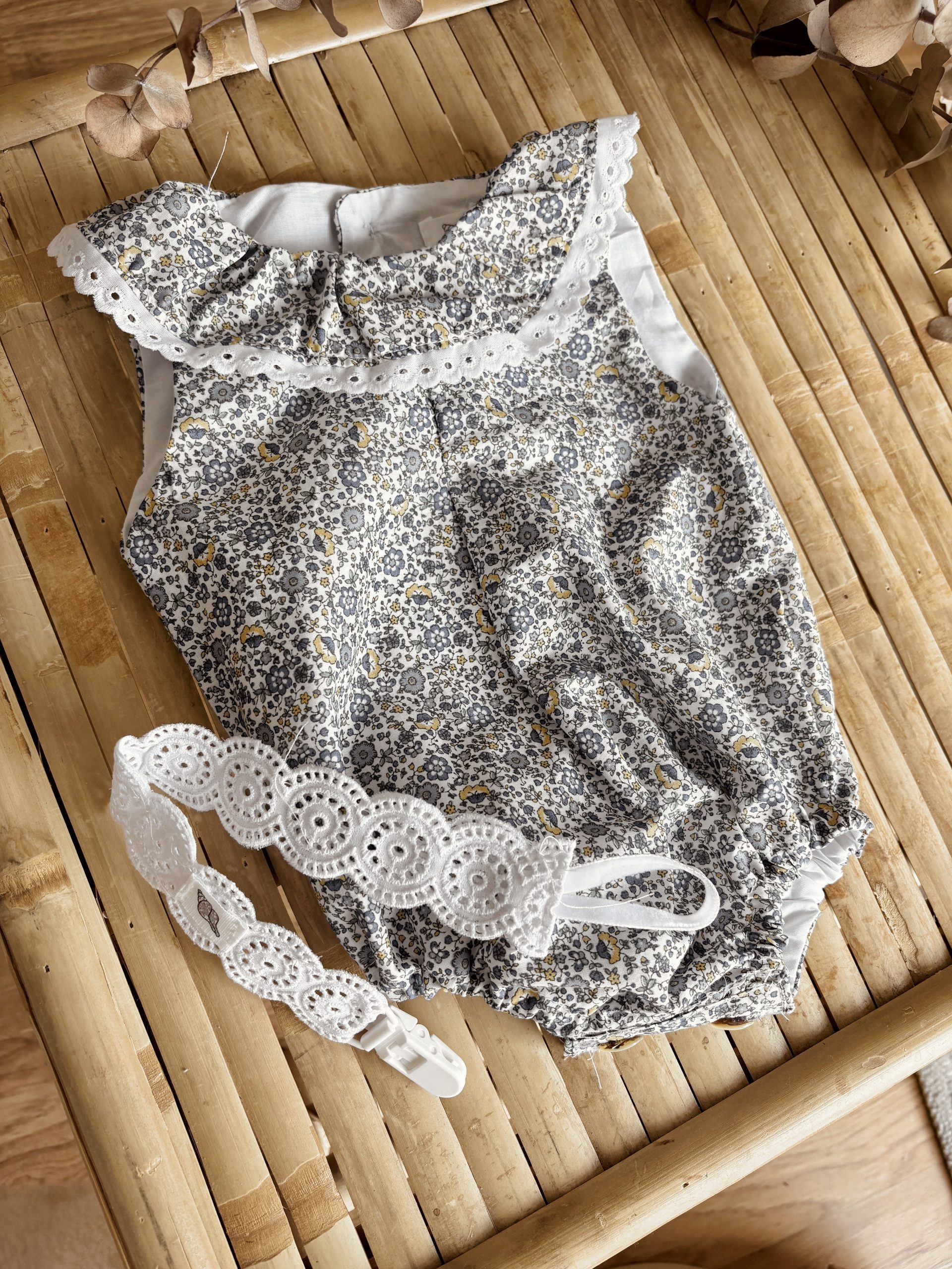 Pelele con volante en el cuello y tira bordad. tela de flores en azul, forrado y con botones en nácar