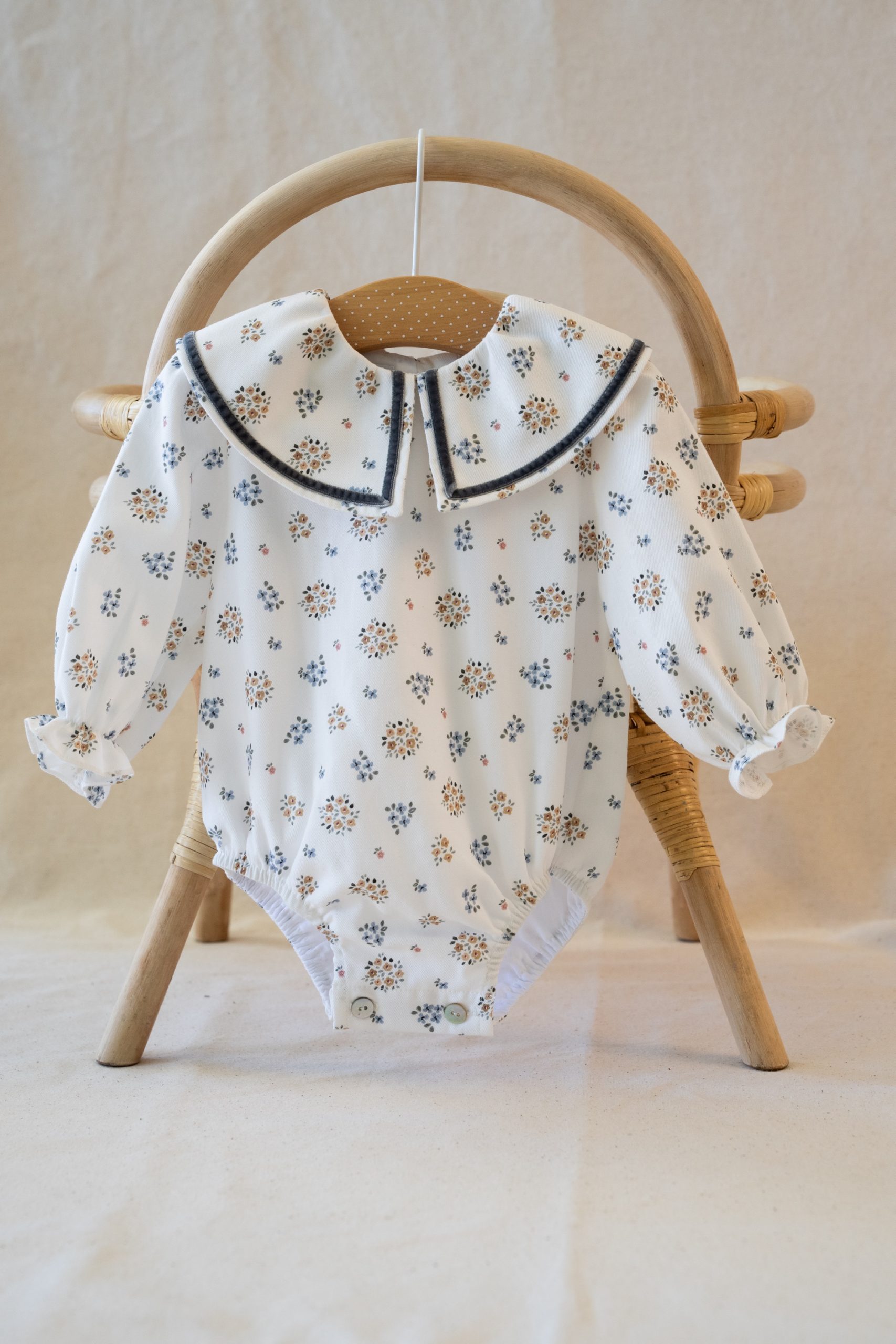 Tanto el puño como el muslo llevan goma blanda para no dañar la piel del bebé y lleva botones de nácar en la entrepierna para facilitar el cambio de pañal.