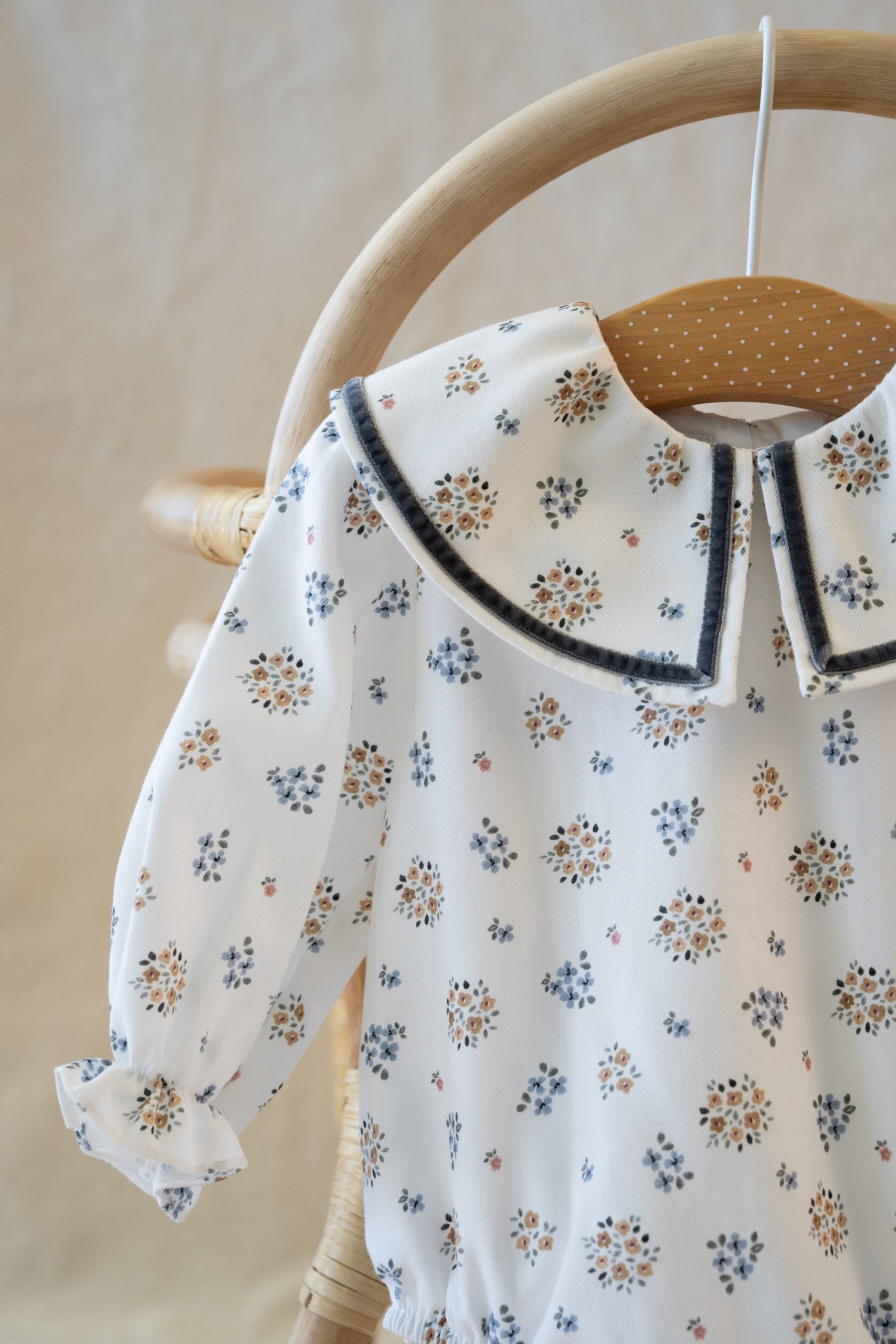 Cuello babero rematado con tira de terciopelo que le da un toque muy especial. Manga ligeramente abullonada. Se abrocha en la espalda.