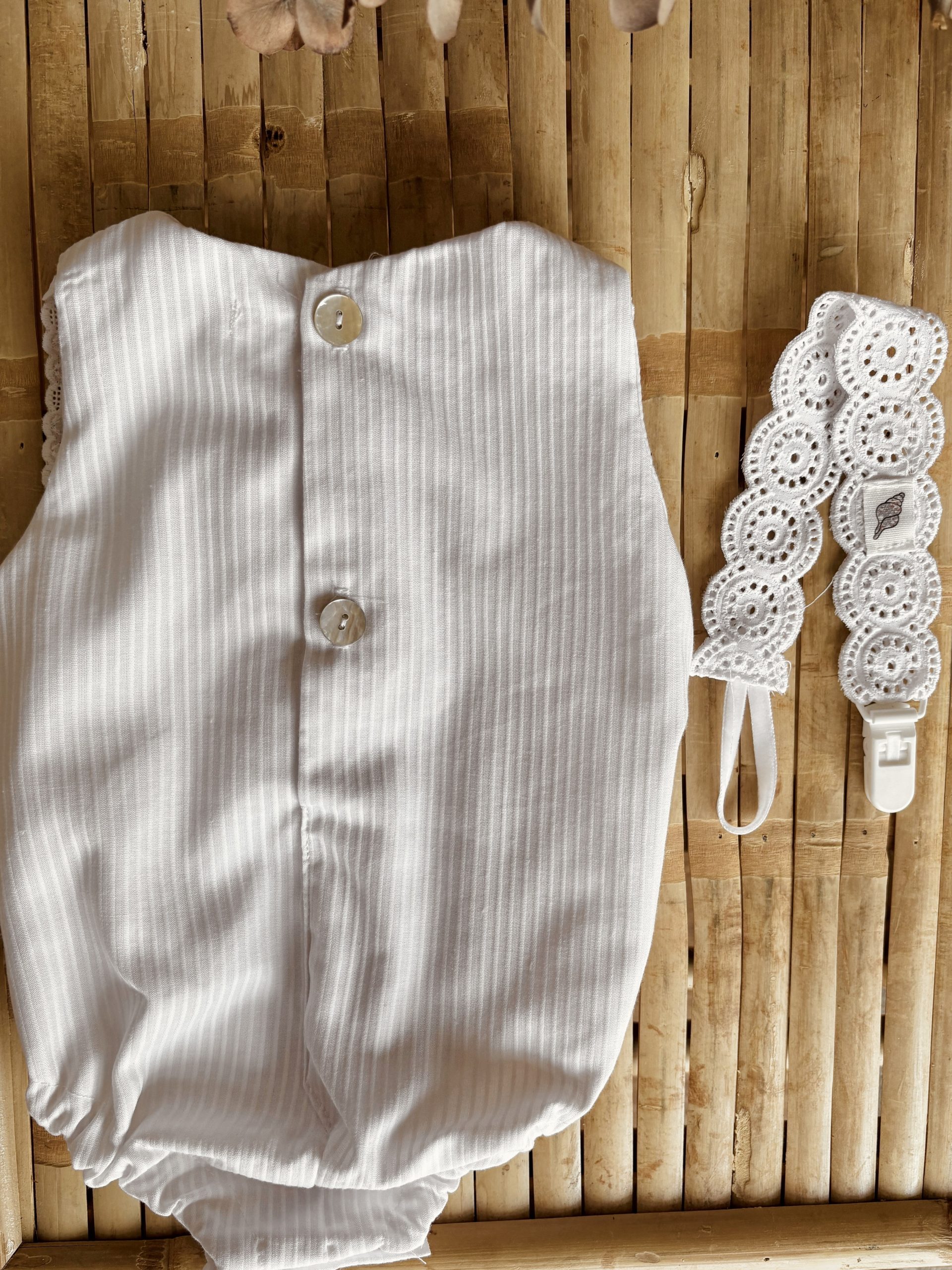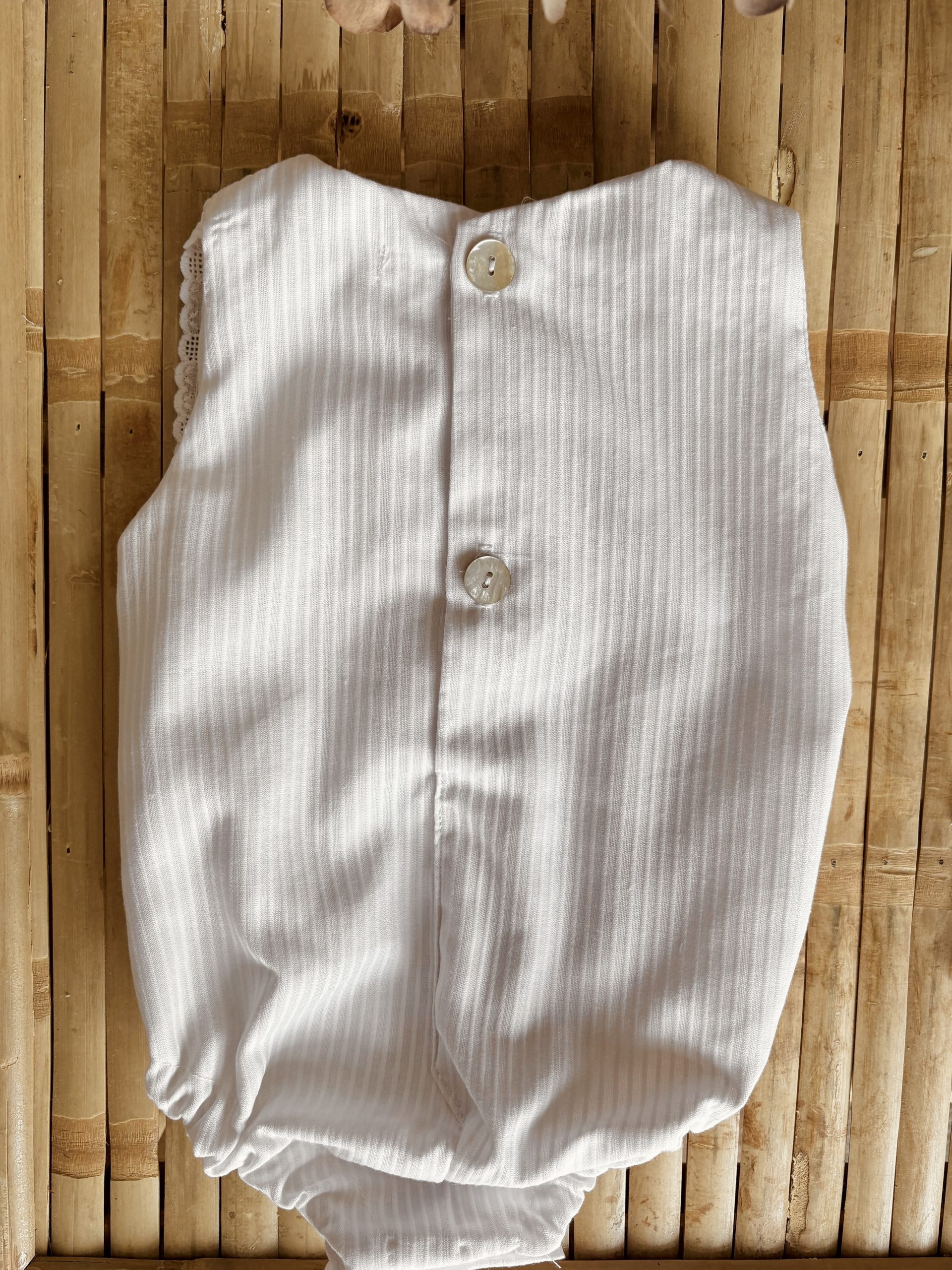Pelele en tela de rayas blanco forrado y con botones de nácar. Perfecto para entretiempo y para combinar en invierno con punto debajo