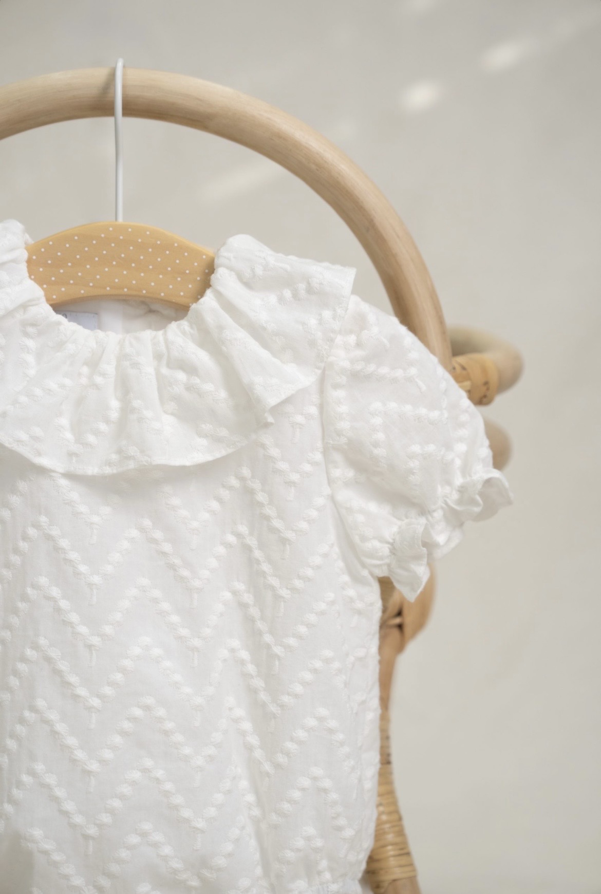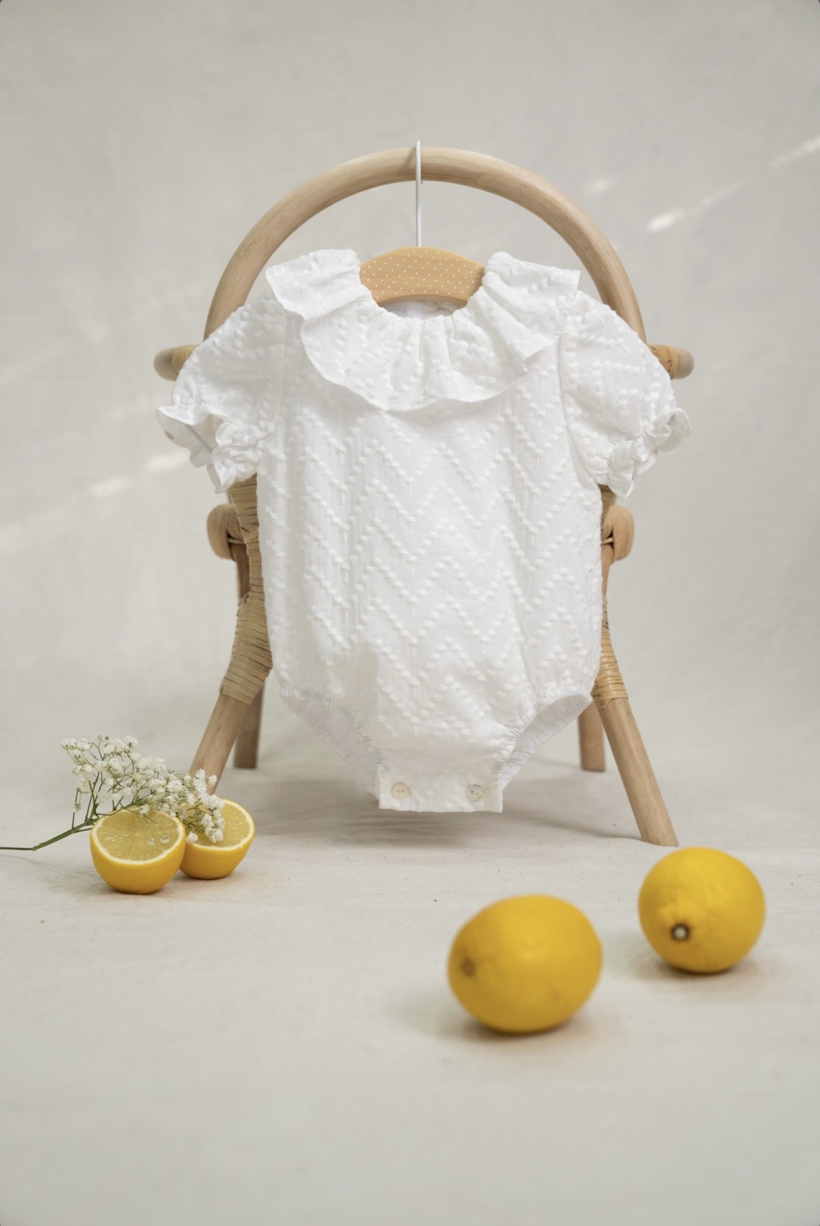 Pelele unisex confeccionado en batista bordada y forrado en algodón 100%.
