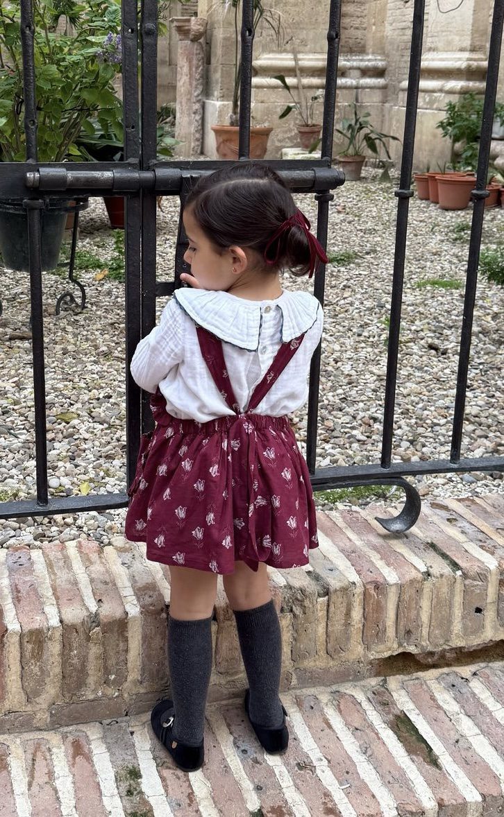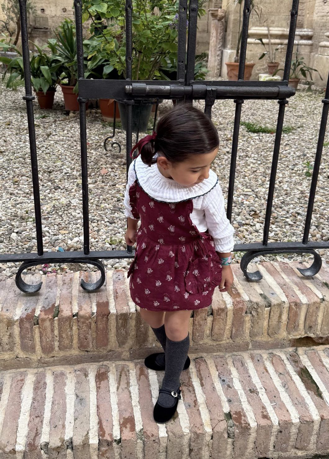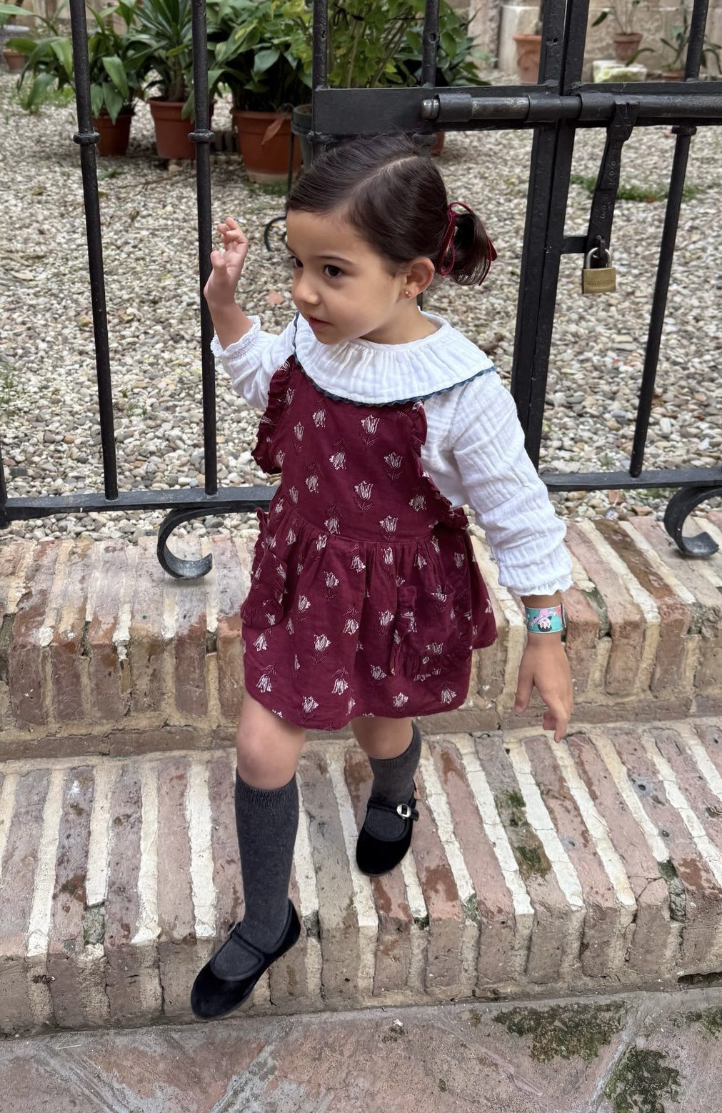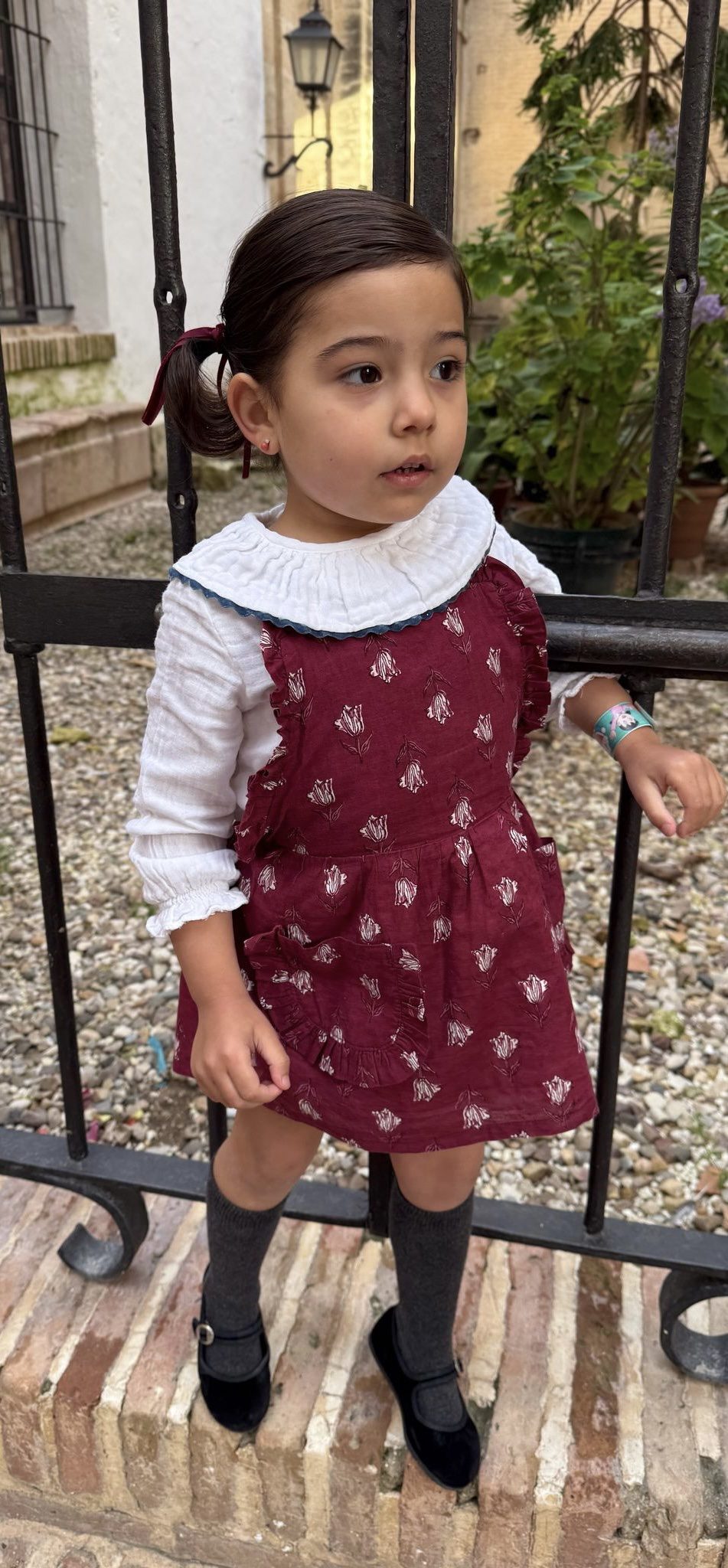 Añade un toque de encanto artesanal a la colección de tu hija con este pichi, confeccionado en suave y transpirable algodón 100%. Su diseño, inspirado en la técnica tradicional del *block print* de la India, destaca por un delicado estampado de flores en tonos blancos sobre un fondo granate profundo. Se abrocha en la espalda con una lazad en el centro lo que asegura un ajuste cómodo , personalizado y práctico. Perfecto para cualquier ocasión, este pichi combina estilo y comodidad.