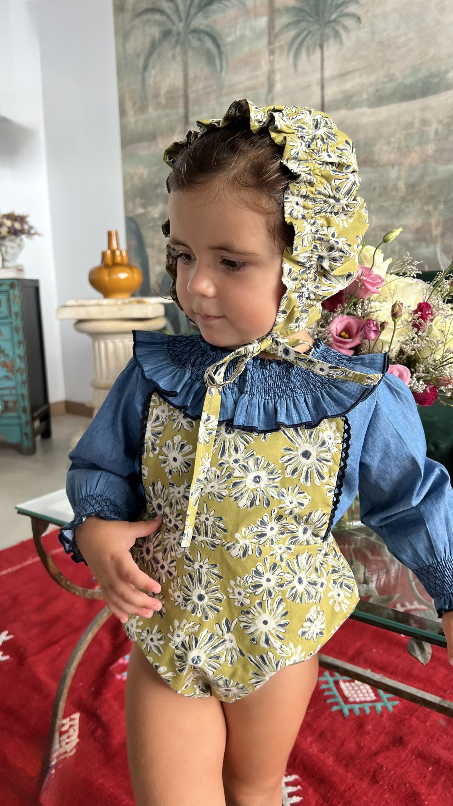Ranita con tirantes y botones. En la parte inferior lleva botones para facilitar el cambio de pañal.