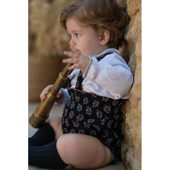 Confeccionado en España en talleres de cercanía, está realizado en micropana negra con estampado floral diseñado por Ju&ca Kids y estampado artesanalmente mediante técnica block print en India.