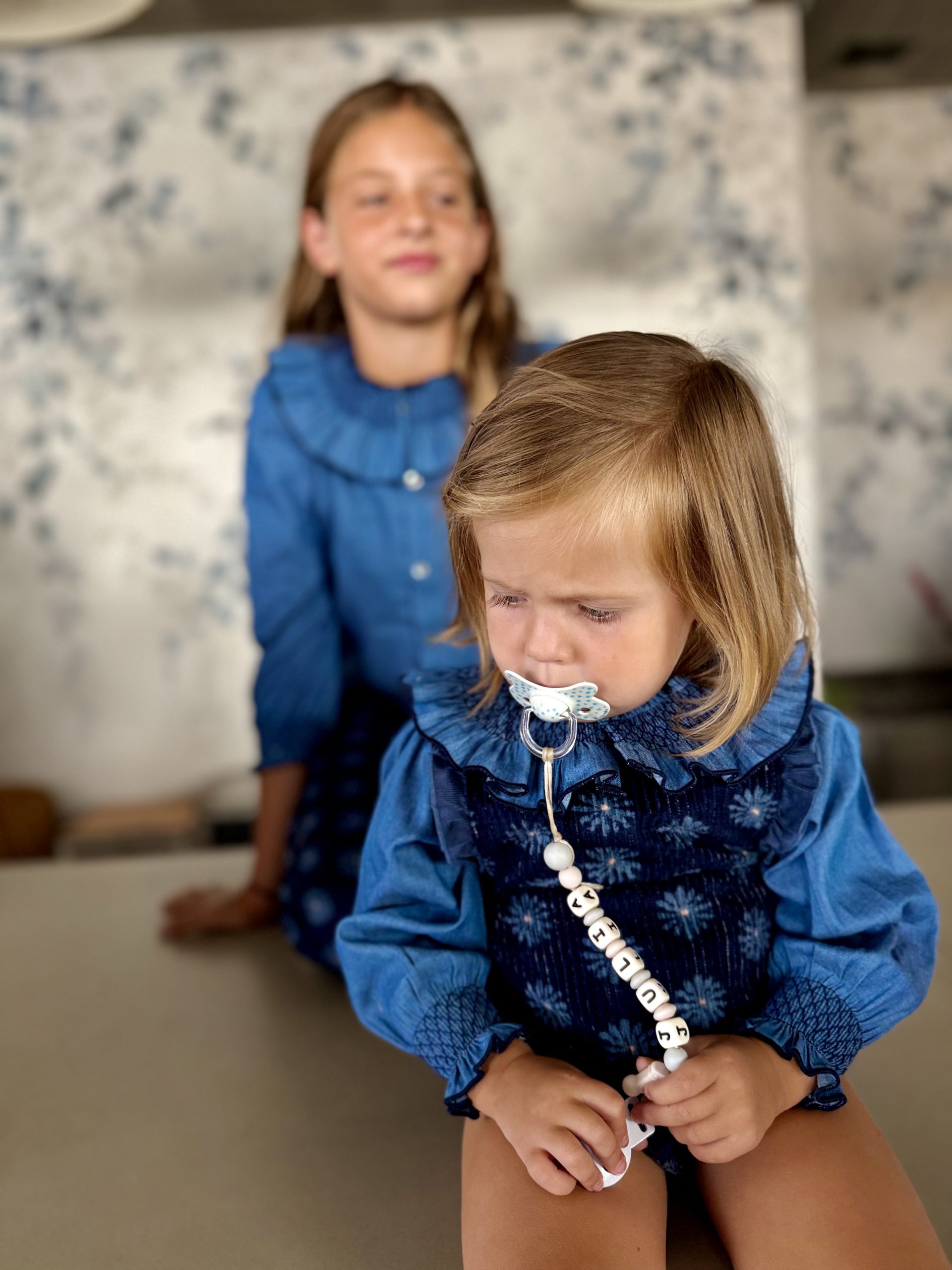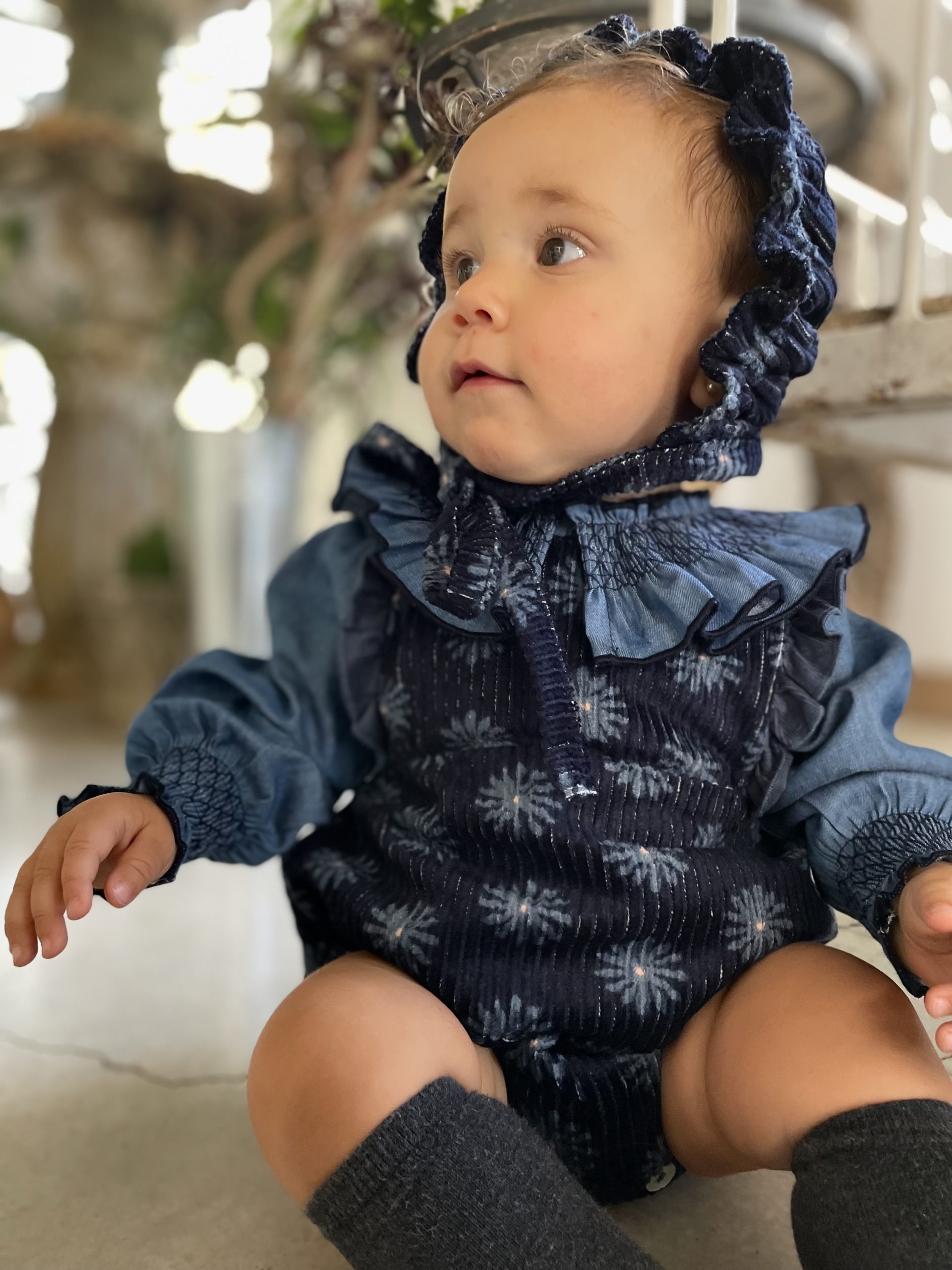 Ranita con tirantes con volante en micropana azulona y botones. en la parte inferior lleva botones para facilitar el cambio de pañal.