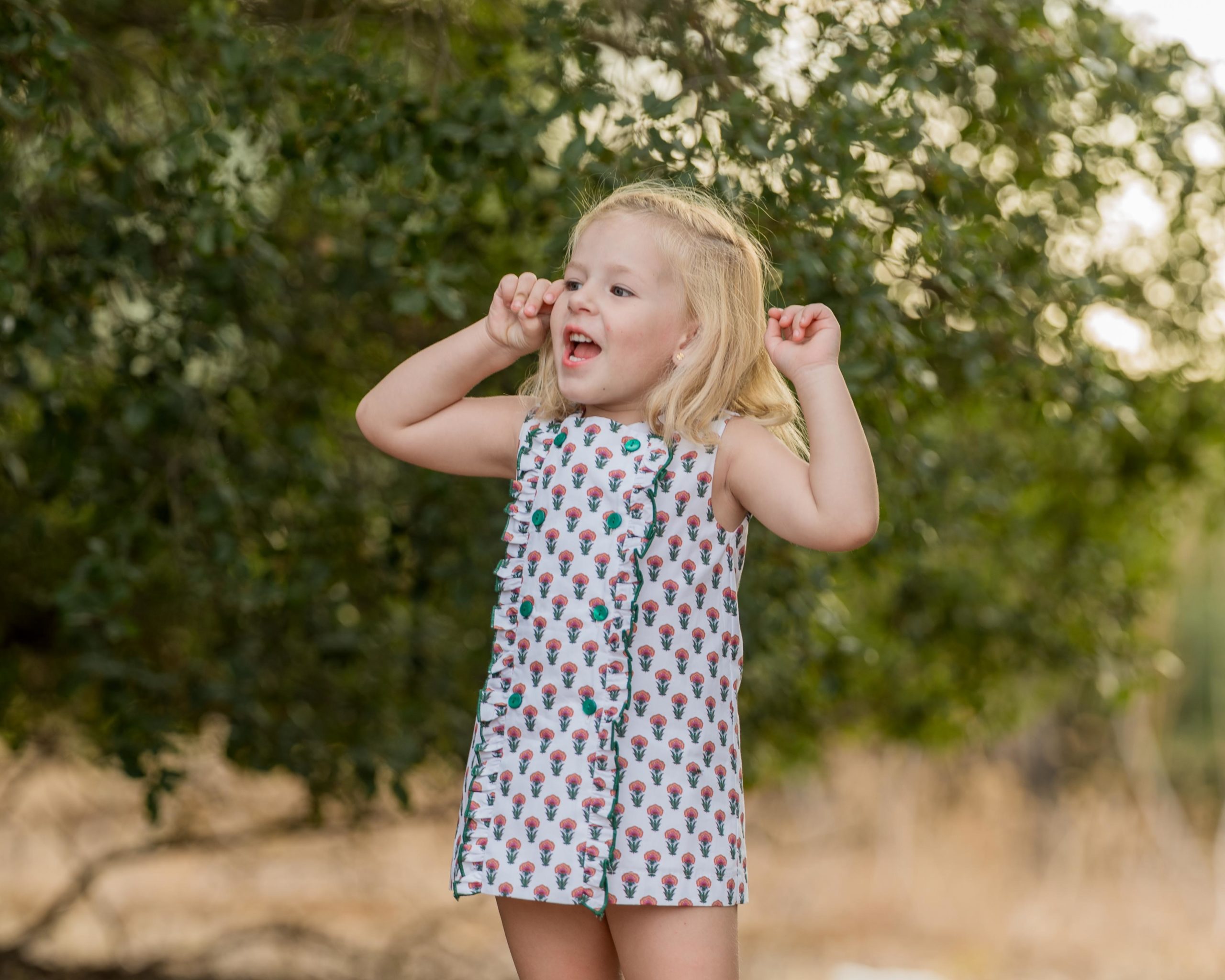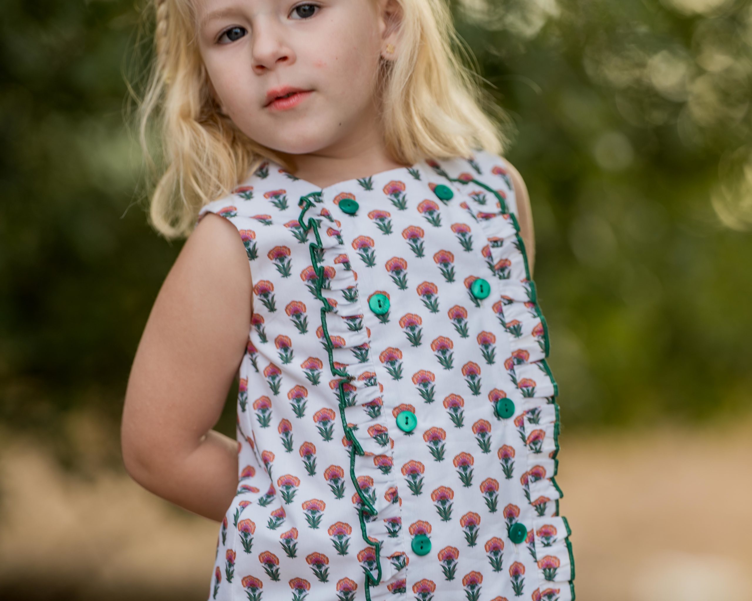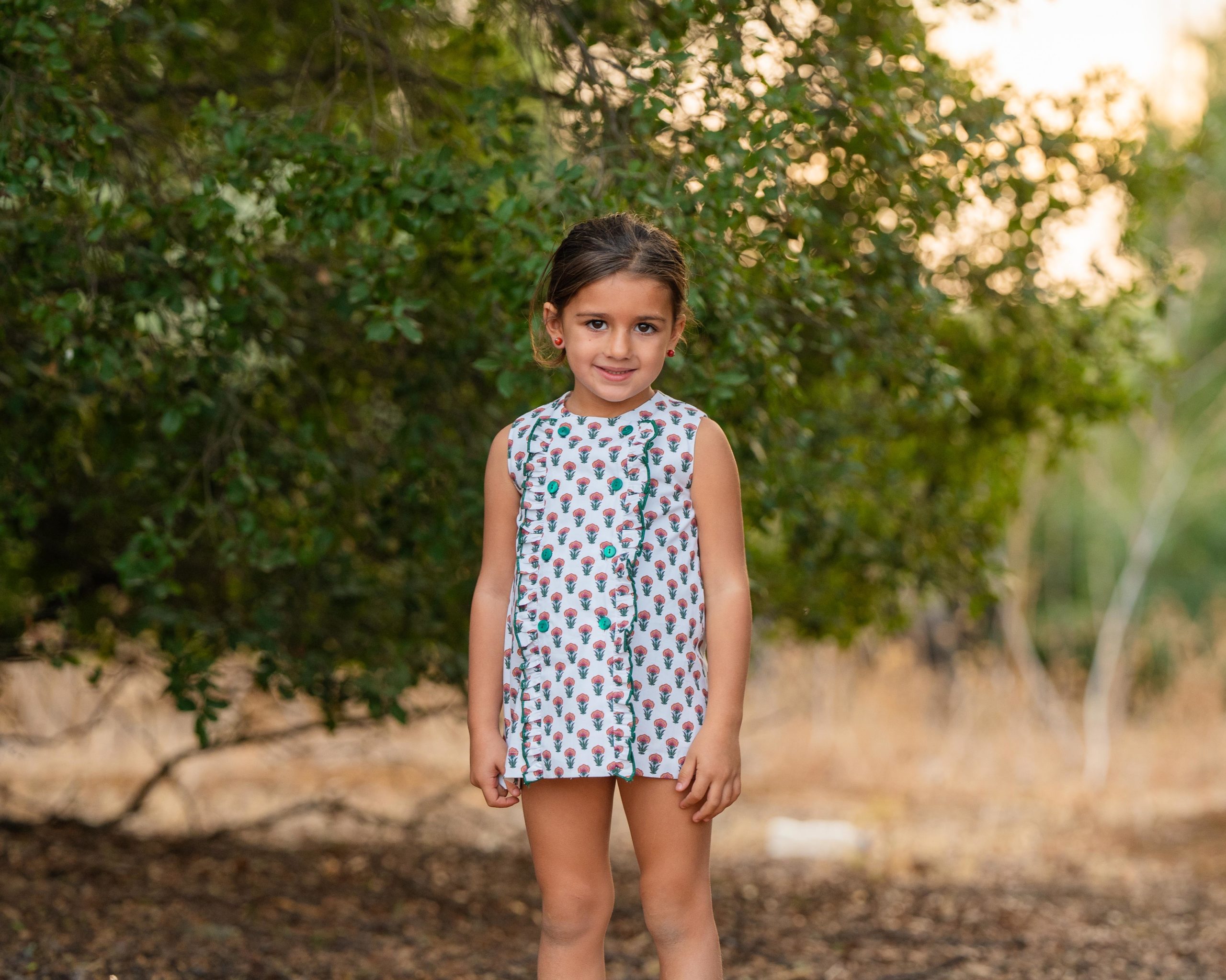Vestido súper especial de flor india en tonos verde, rosa, caldera y rojos. Diseñado en mangas sisa con delantero con volantes en repulgo verde. Abotonado en tono verde que lo hacen un look perfecto para esta primavera.