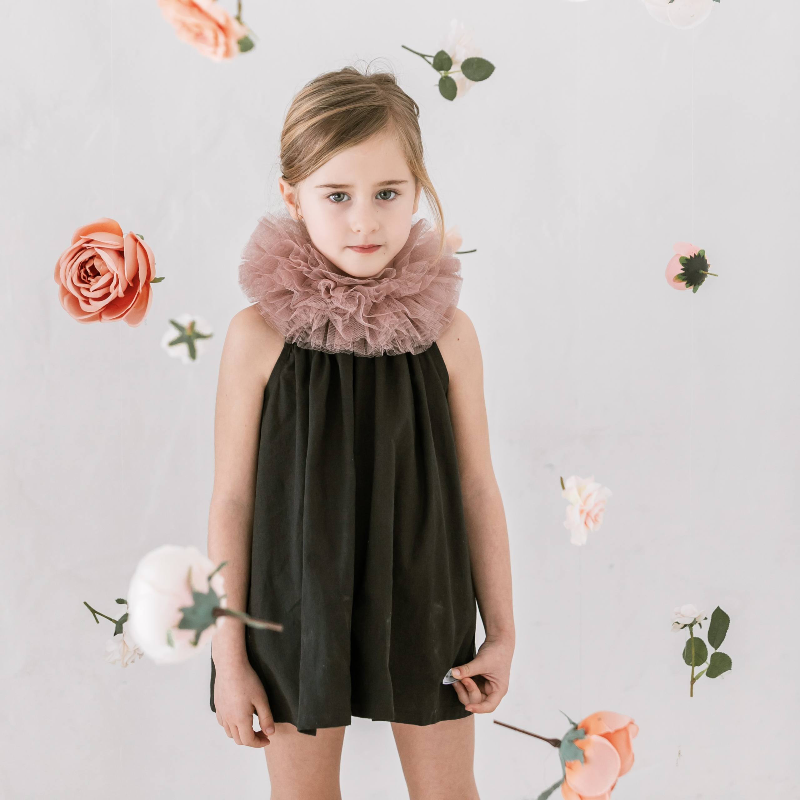 • Vestido con cuello a la caja y volantes en hombros. Cierre con botón en cuello.