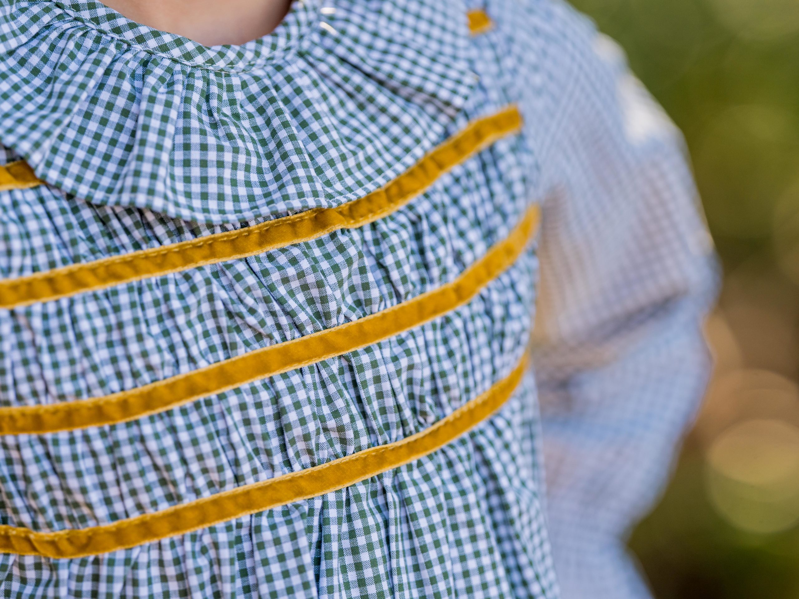 Maravilloso vestido de cuadros verdes con pecherín engomado con terciopelo mostaza y cuello volante que lo hacen especial.