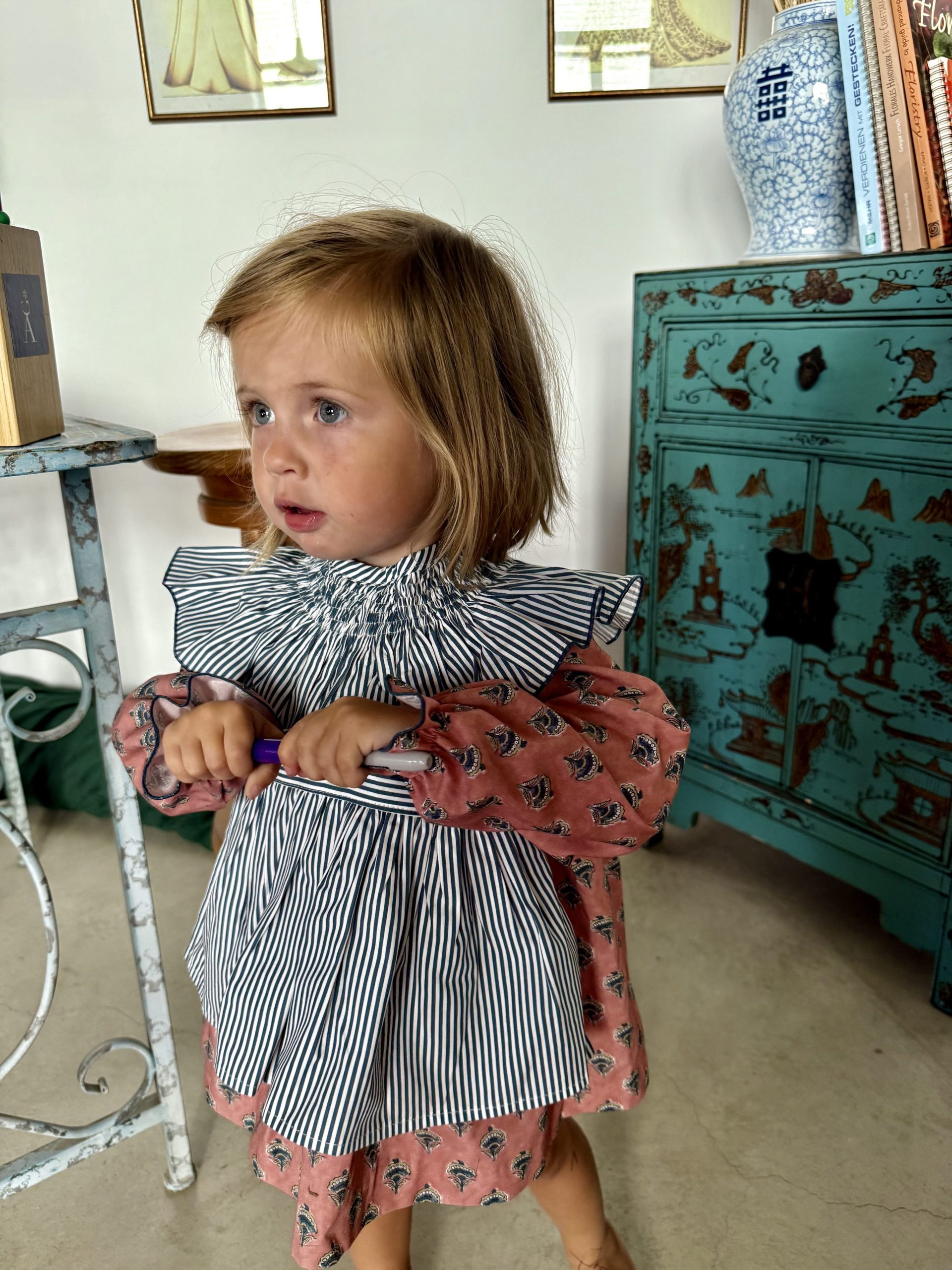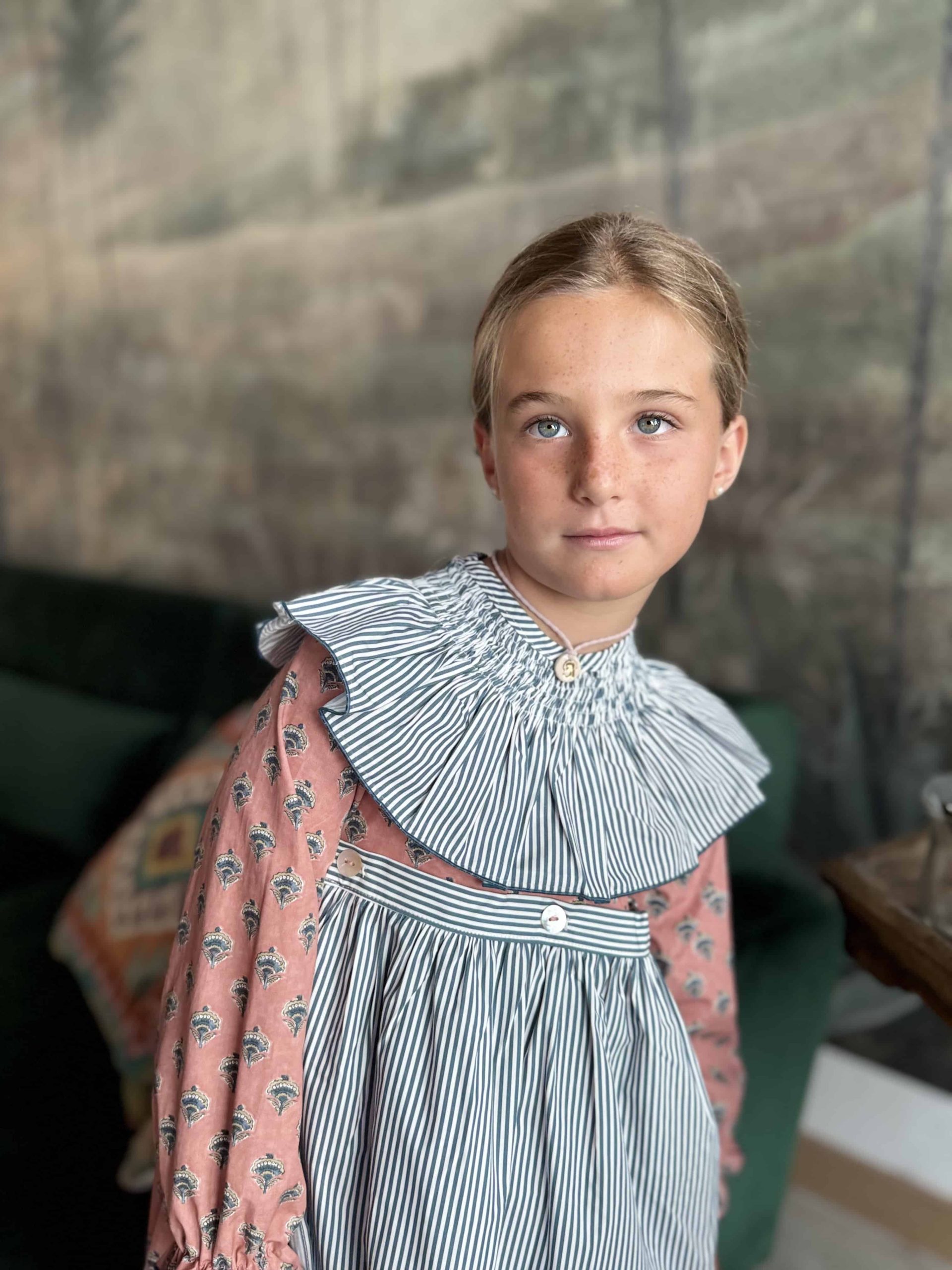 Vestido de manga larga con cuello engomado y delantal de quita y pon con tres ojales con botones de nácar, se abrocha en la espalda.