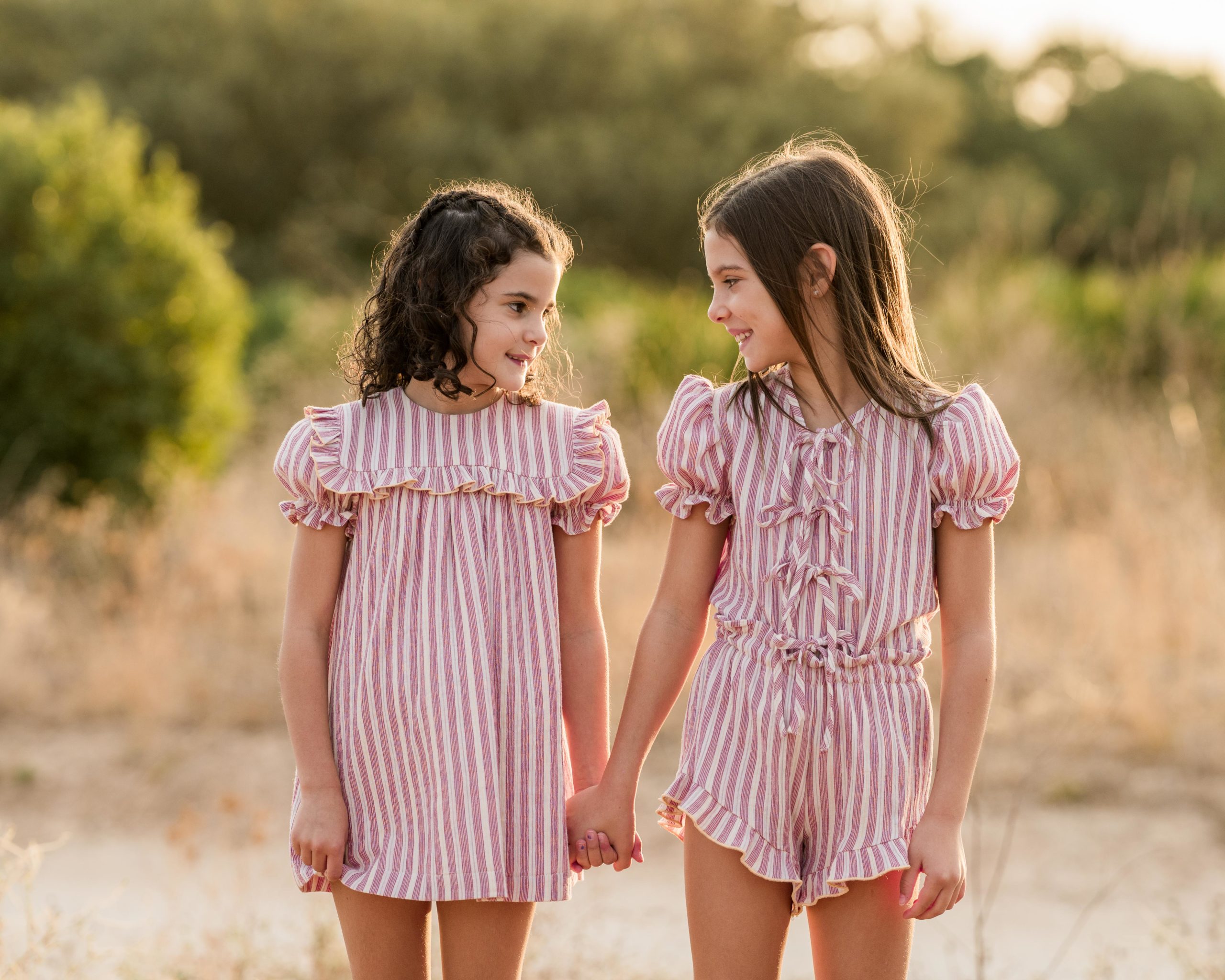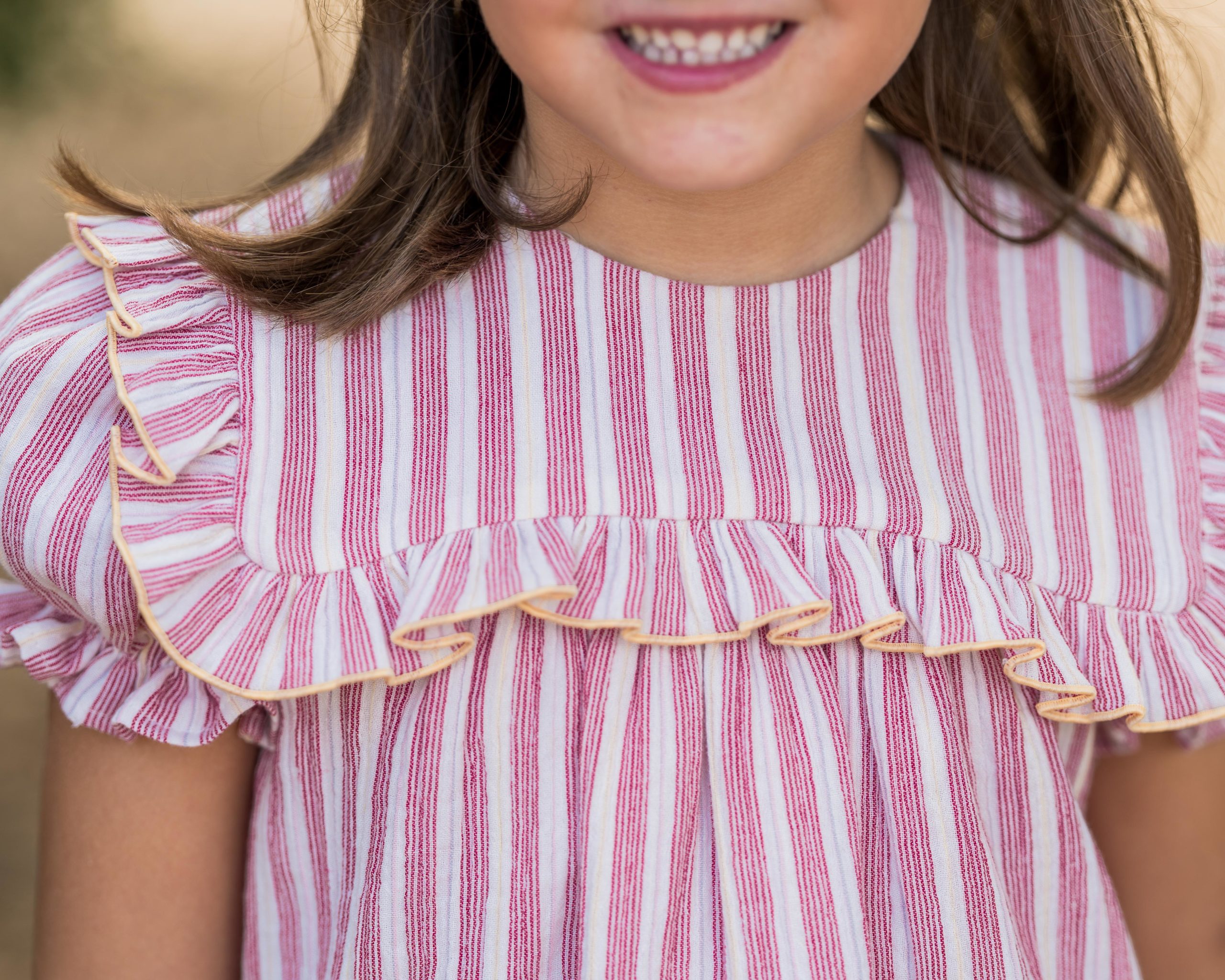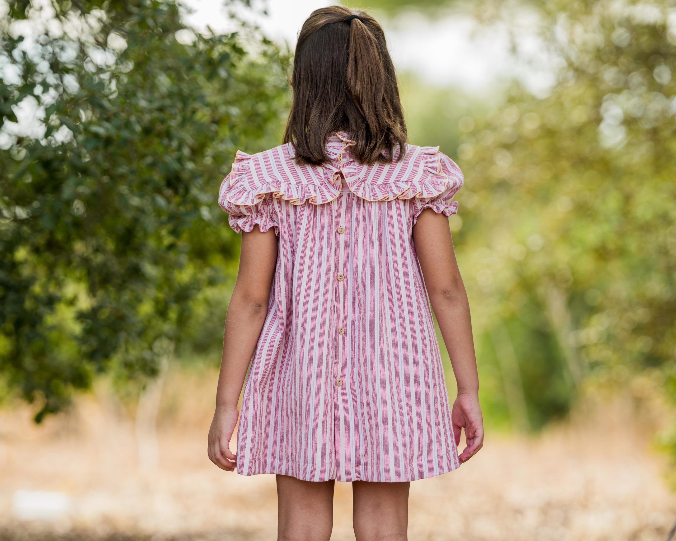 Vestido de manguita farol con cuello marinero acabado en volante con repulgo en mantequilla, tejido de rayas rojas, azules, amarillas y tono rosa en doble gasa.