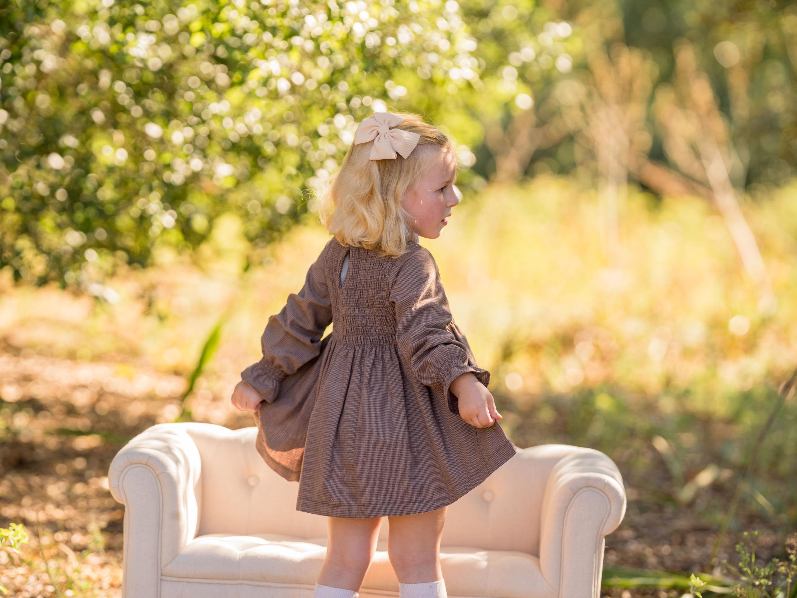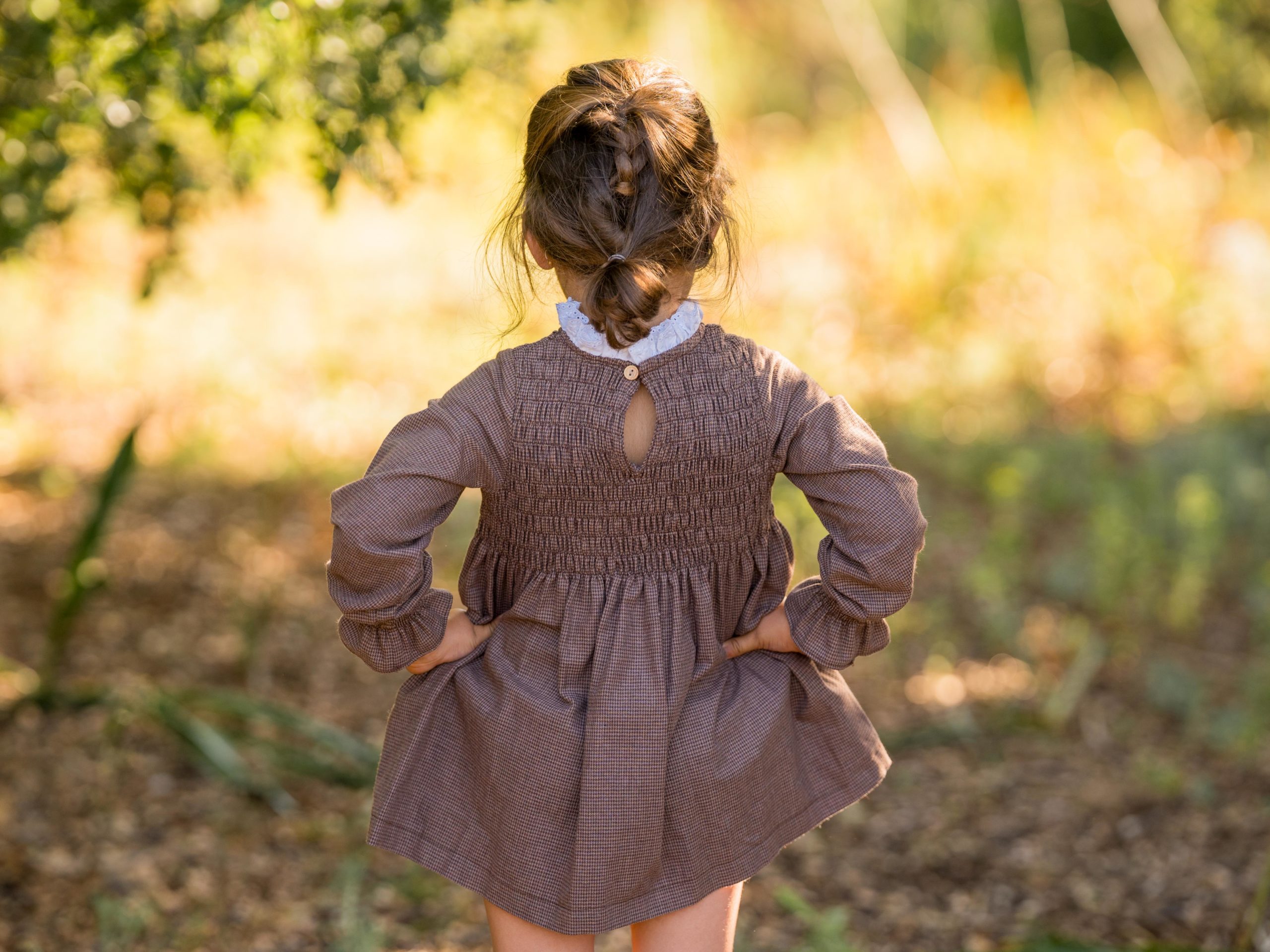 Este Vestido de cuadros marrones con su pechera engomada y su tira bordada como cuello lo hacen muy especial para eventos.